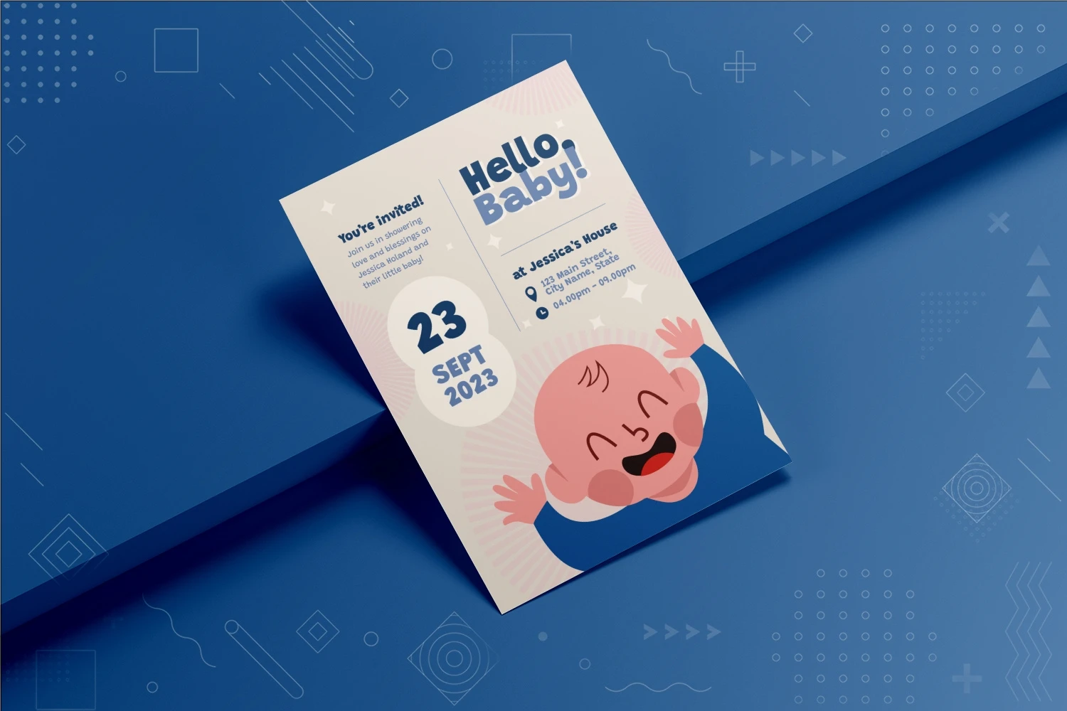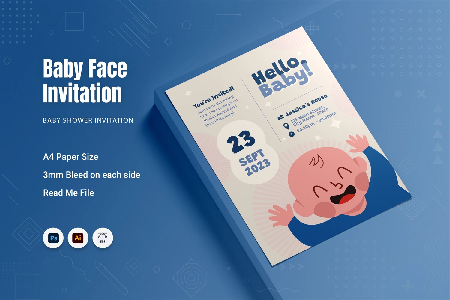A **Baby Face Baby Shower Invitation** can be used for your baby shower or baby's birthday. You could also use it as a promotion for baby and parent photography services. Match the needs, whether personal or business. This template is easy to adjust and easy for you to edit according to your taste.
