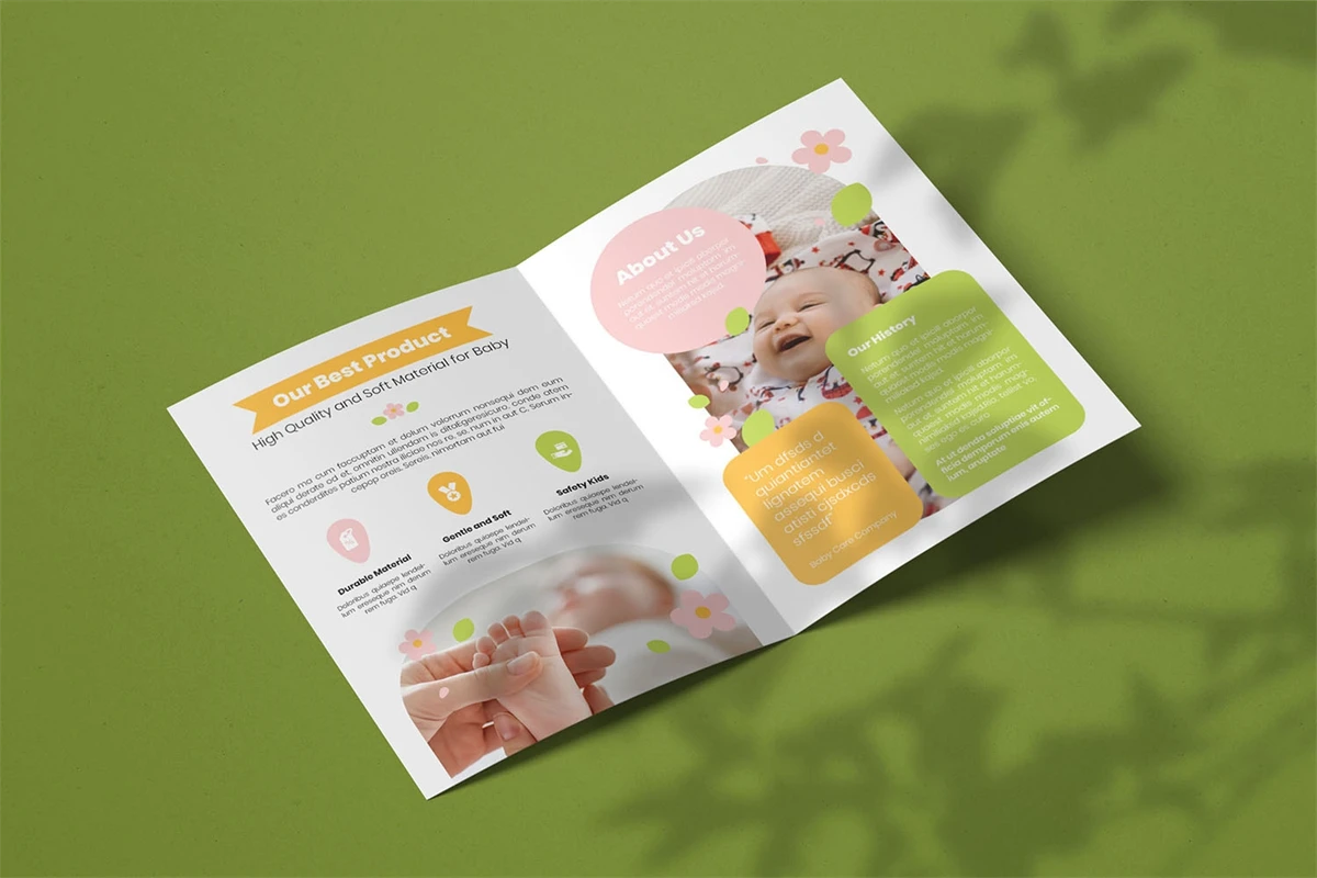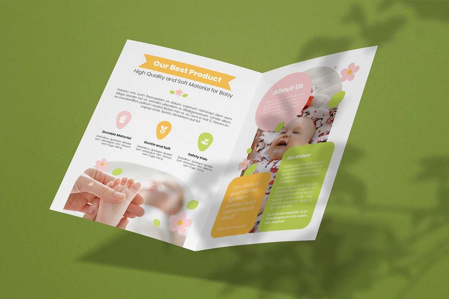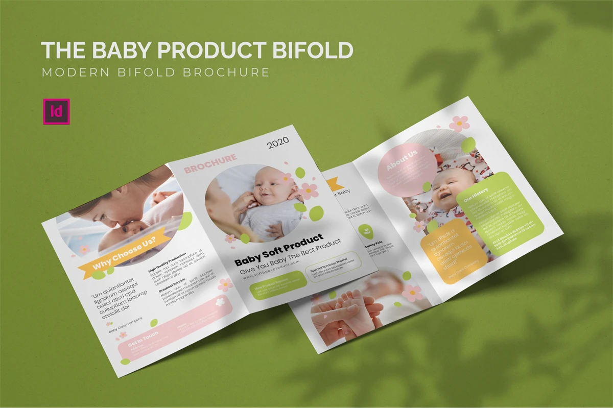 Baby Product - Bifold Brochure We present this Bifold Brochure for you, simple and very elegant, and this Bifold Brochure is suitable for all types of your business, made with adobe inDesign, very easy to customize, Hope you Like it, dont forget to rate, Thanks.
