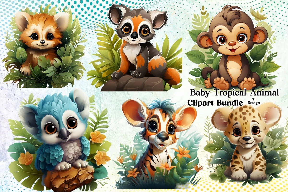 Watercolor Baby Tropical Animal Clipart PNG Bundle