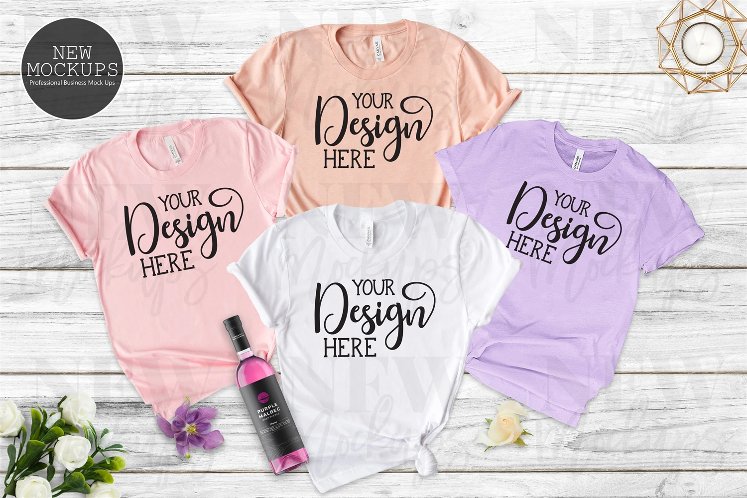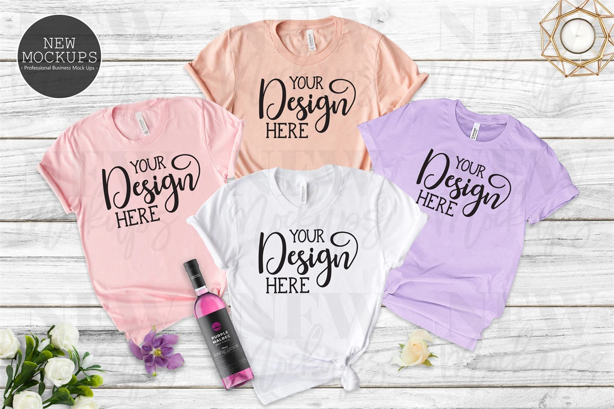 Bella Canvas 3001 Pink, White, Heather Peach and Heather Prism Lilac Group Bride T-Shirt Mockup