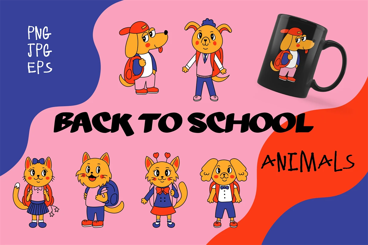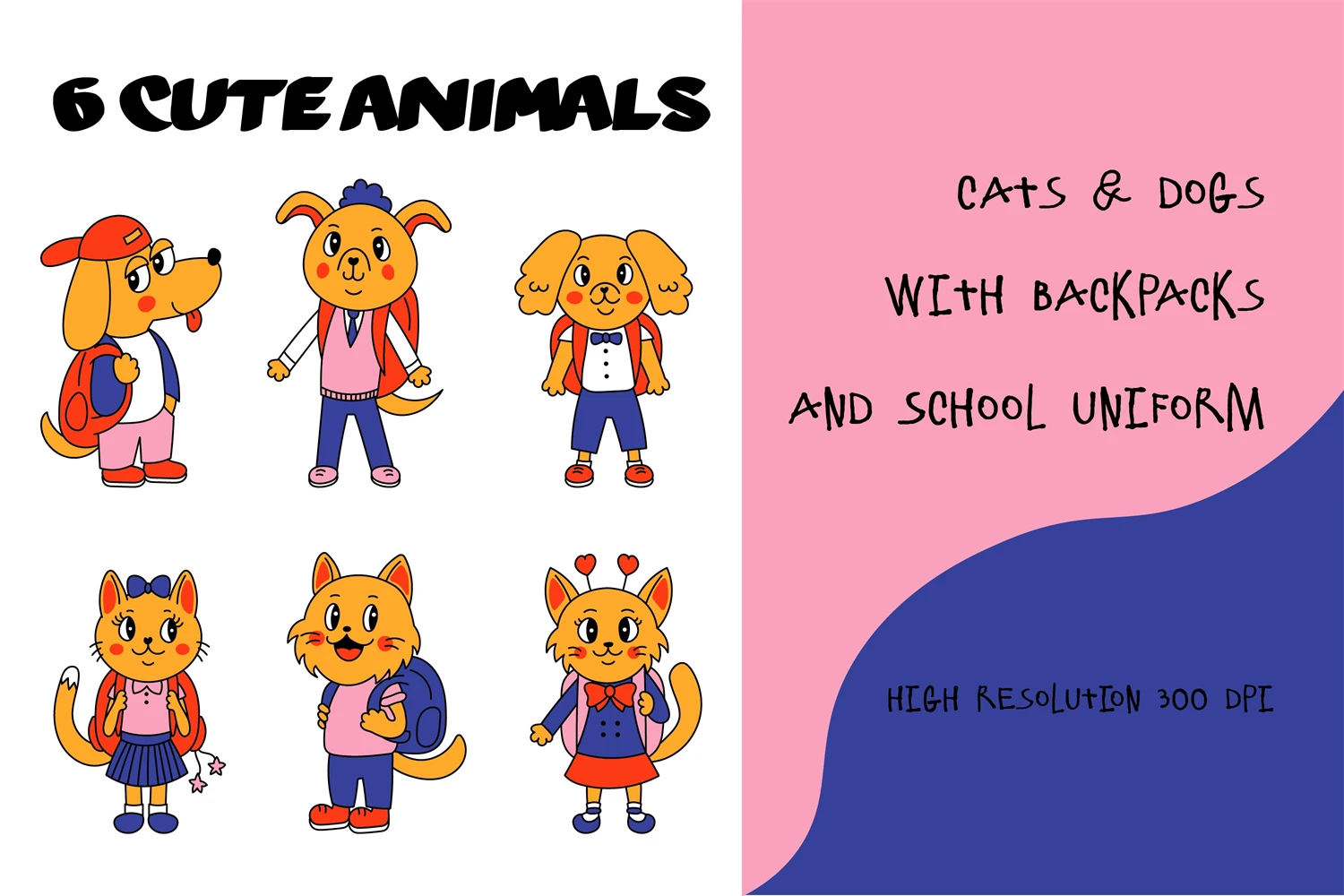 Funny cartoon style schoolboy and schoolgirl cats and dogs in school uniform with backpack. Trendy childish animal illustration, puppies and kittens for kids, school, university, primary school, kindergarten, education, studying, youth topics, sublimation, t-shirt print, poster, greeting card, pets, mugs, bags, tumbler, pillow, home interior, decoration, stickers, accessory, card making, invitation, Social media, party decoration, website design, DIY project, handmade (decoupage, scrapbooking), frame art, book cover, etc.