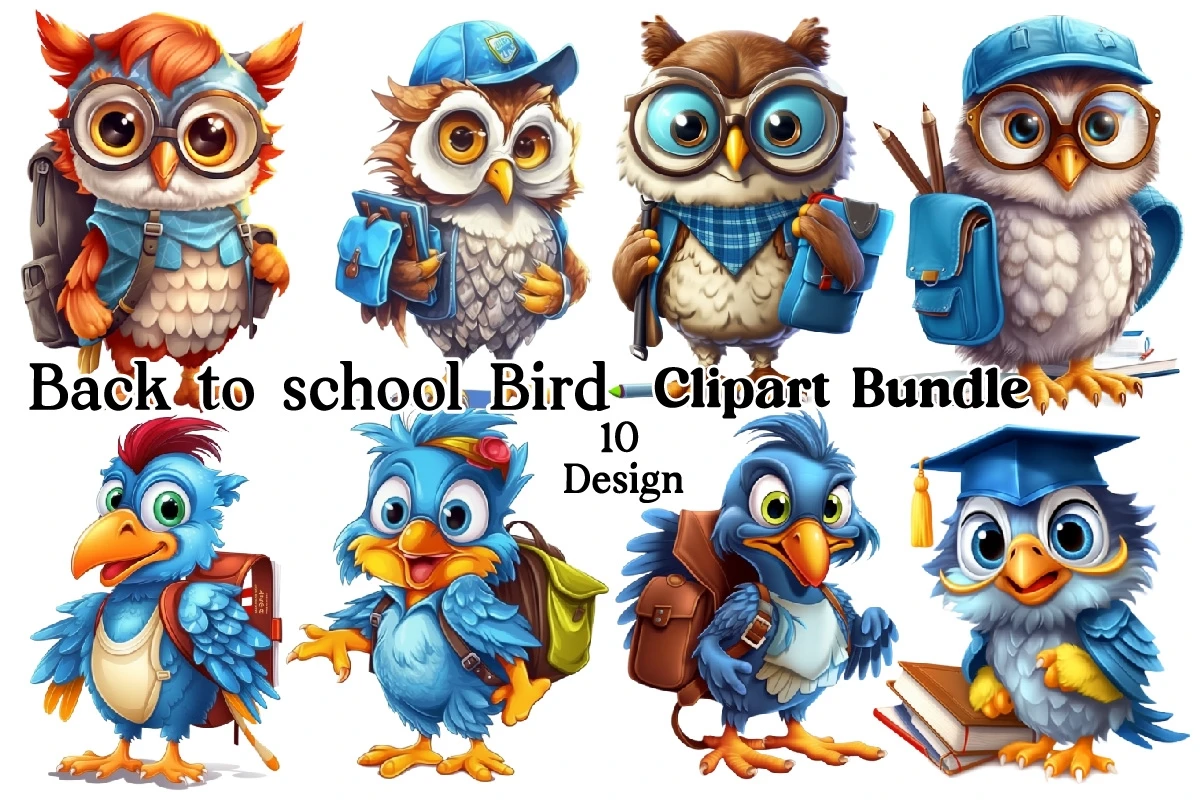 Watercolor Back to school Bird Clipart PNG Bundle