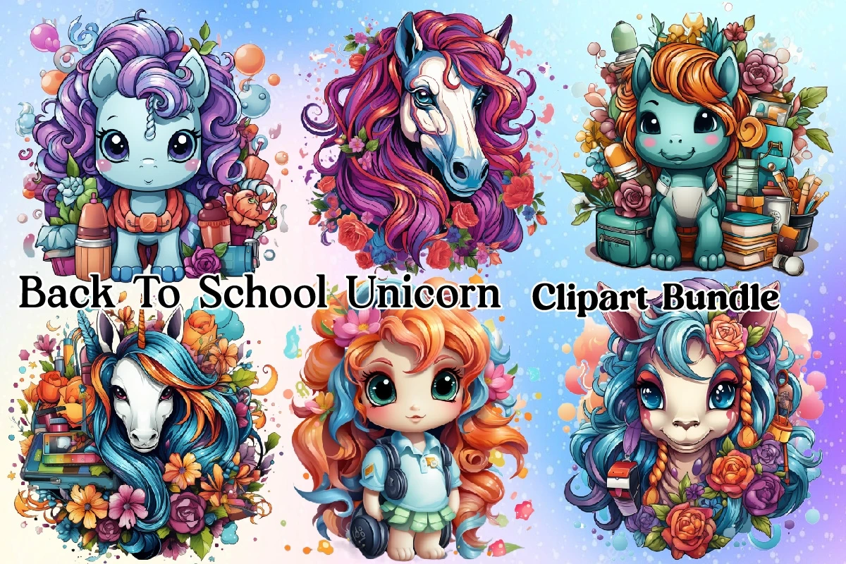 Watercolor Back To School Unicorn Clipart PNG Bundle