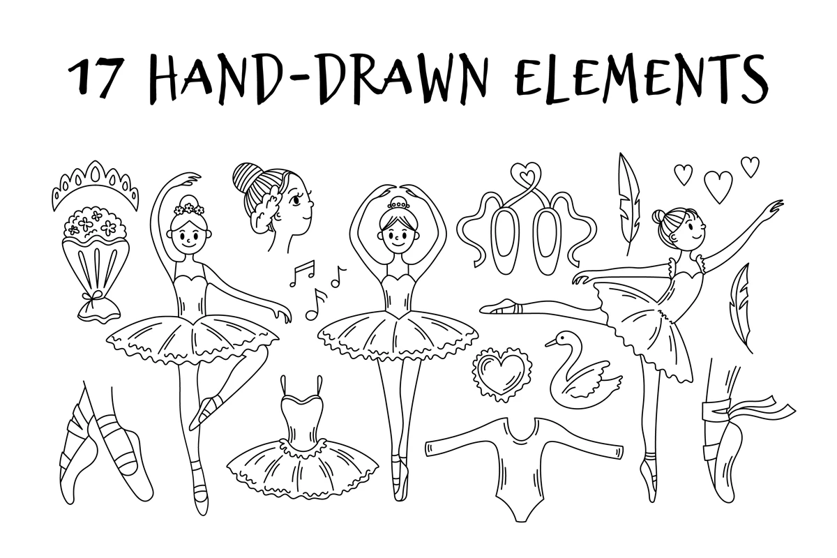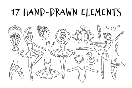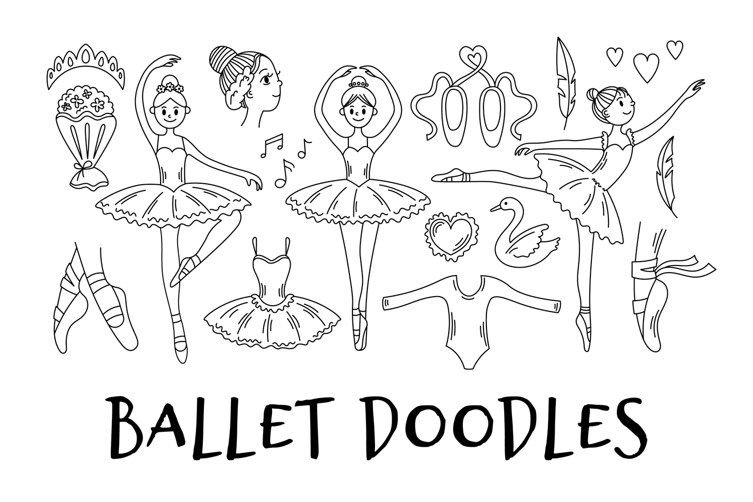 Cute set of hand-drawn ballerinas and ballet elements. Black line art accessories, tutu, pointes, ballet dress. Decorative sketchy vector illustration in doodle style for little girls, ballet school, theater topics.