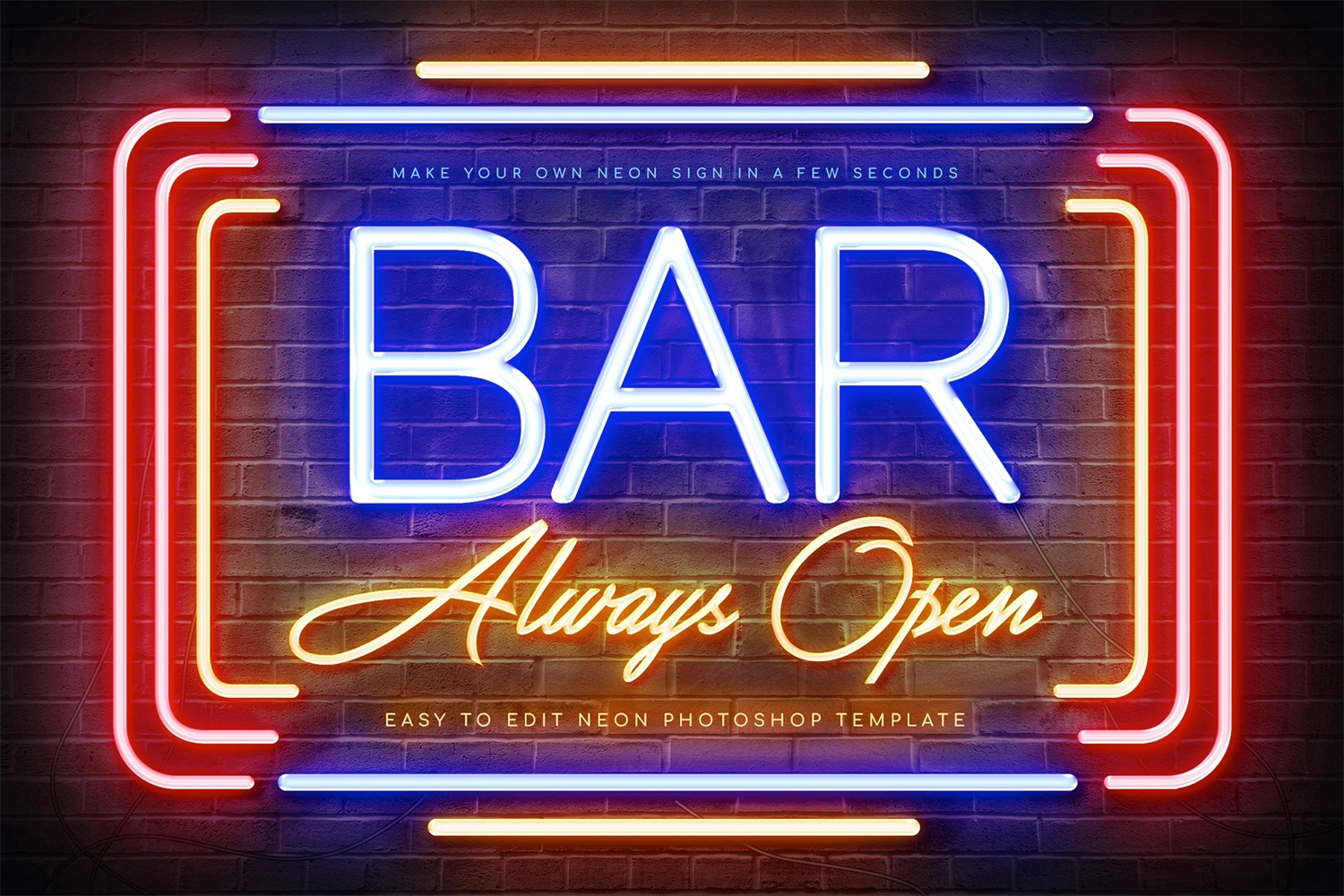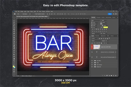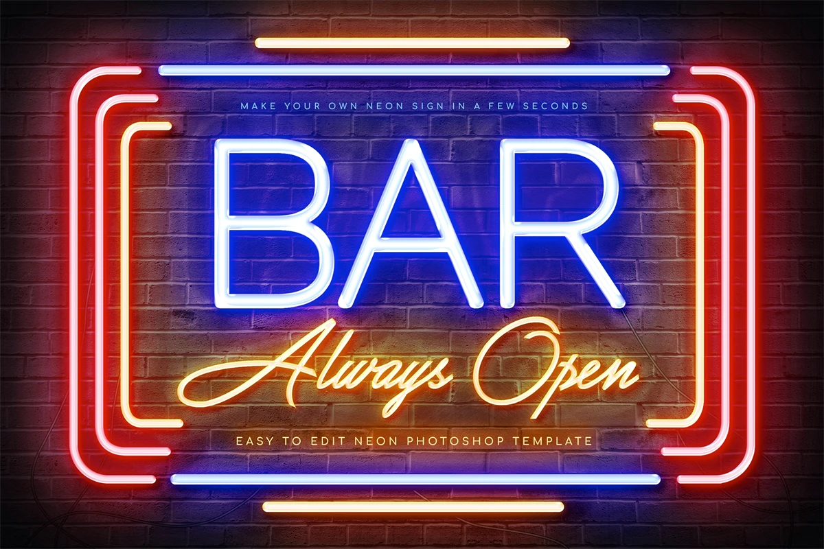 Step into the vibrant world of nightlife with the Bar Neon Sign Photoshop Template. This captivating template channels the allure of neon lights, bringing a touch of urban sophistication to your bar's branding.