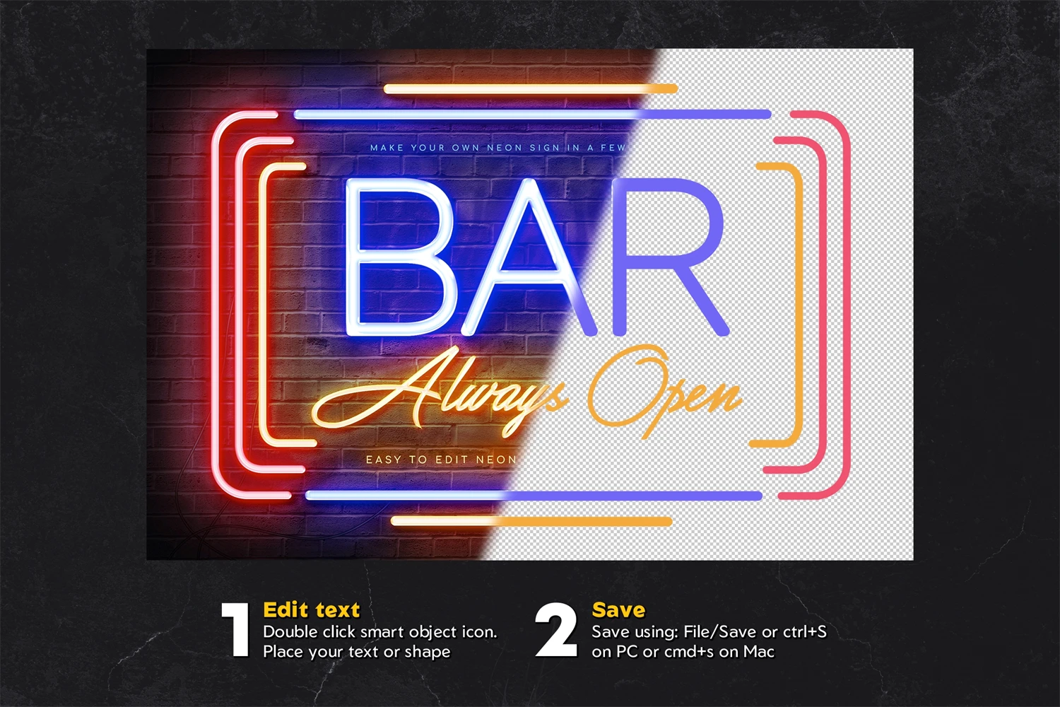 You can make neon sign concept or use Neon Sign Template for print and web graphics. Advertisement graphics, banners, Instagram and Facebook banners, YouTube graphics, social media posts, flyers and posters, movie titles, promo ads and much more!