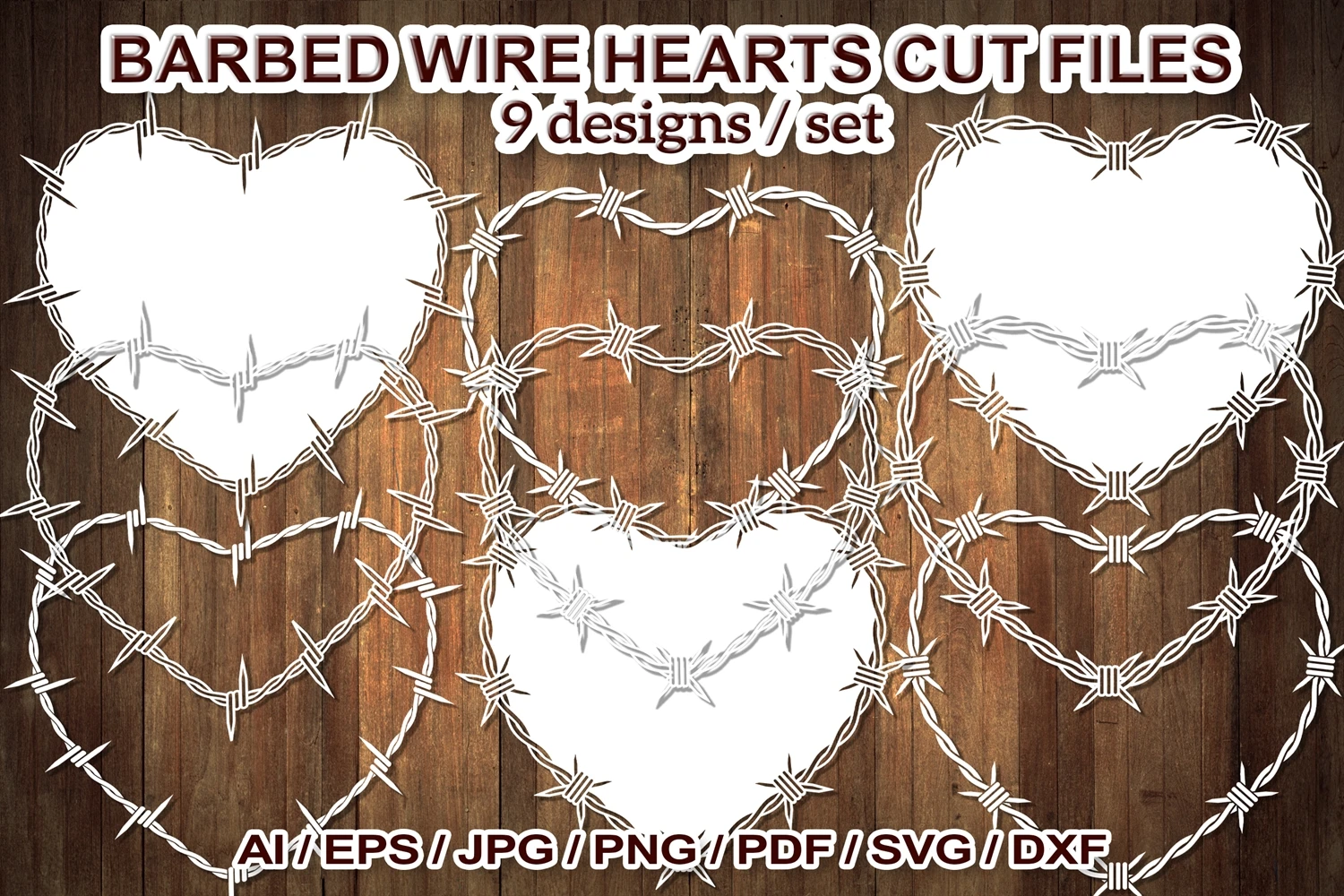 9 designs of barbed wire heart shape border frames, SVG Clipart Cut Files for your creative DIY projects and Wedding Decor, or Home Decorations. Perfect for the papercut, scrapbooking, card stock, home decor, wedding decor, and other DIY projects. Options are endless!