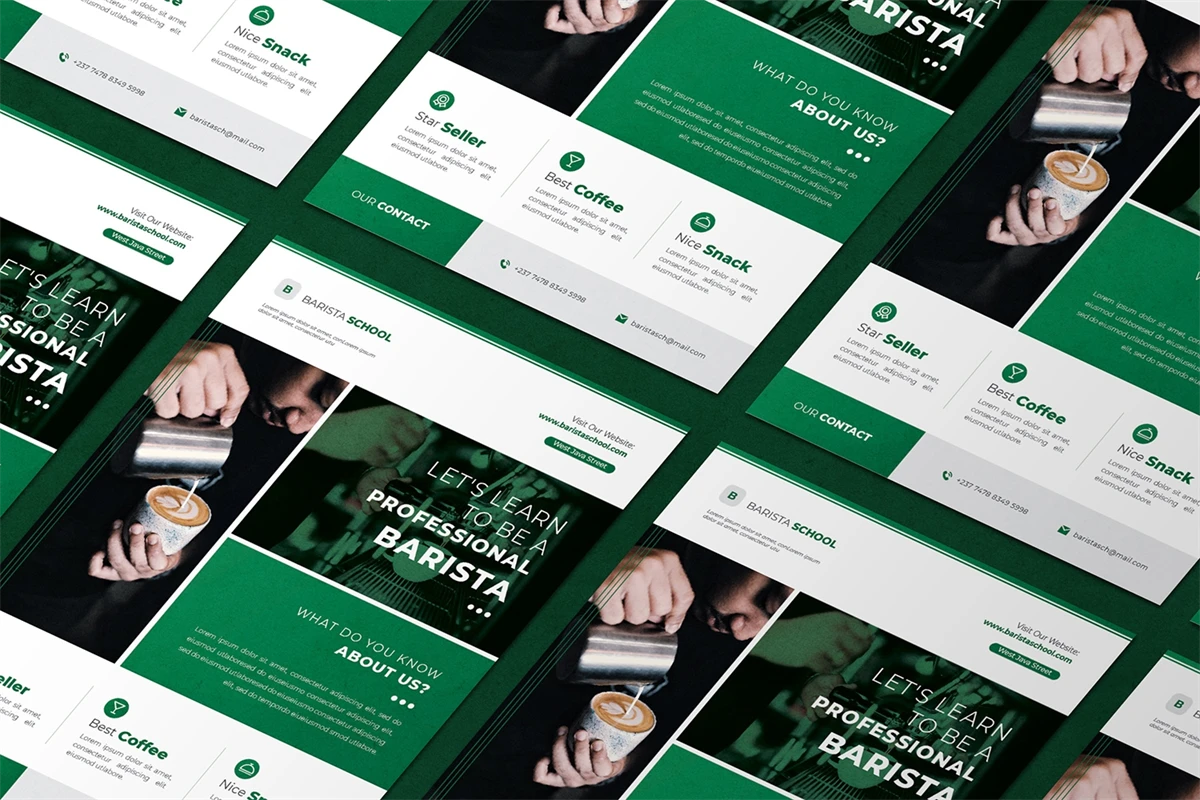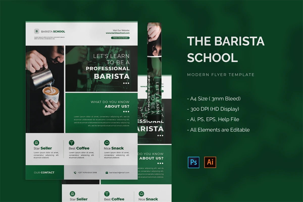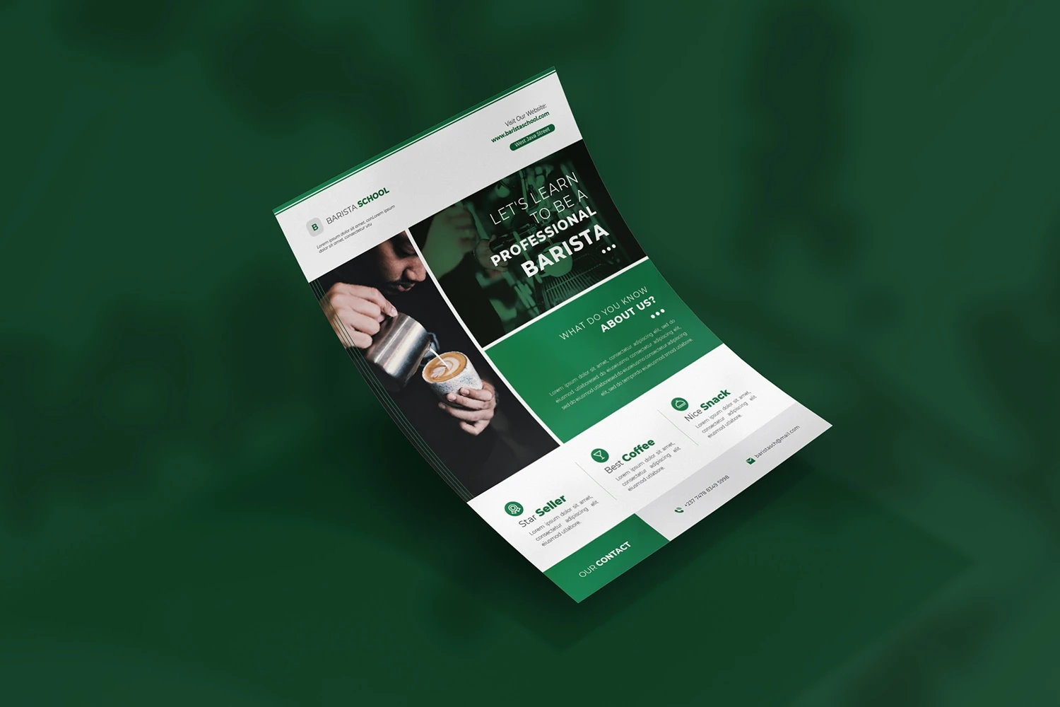 Barista School - Flyer. This Flyer template is designed for your company's business needs. very clean and elegant, and also easily edited and adjusted to your liking