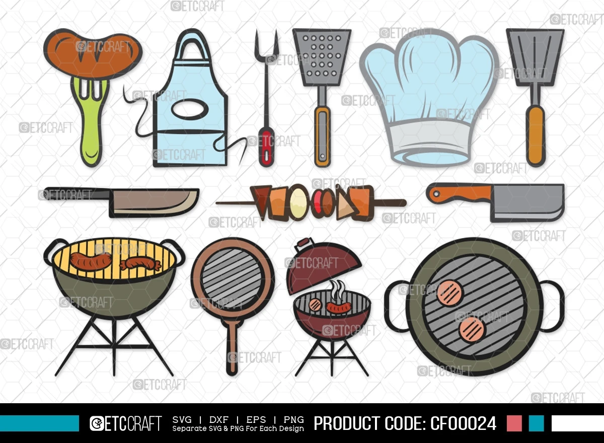 Explore our enticing BBQ Clipart Grill Barbecue Grilling Kitchen SVG Cut File Bundle, a sizzling collection tailored to ignite your creativity! Elevate your BBQ-themed crafting projects with these dynamic designs, perfect for all enthusiasts of the grill.
