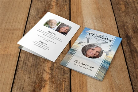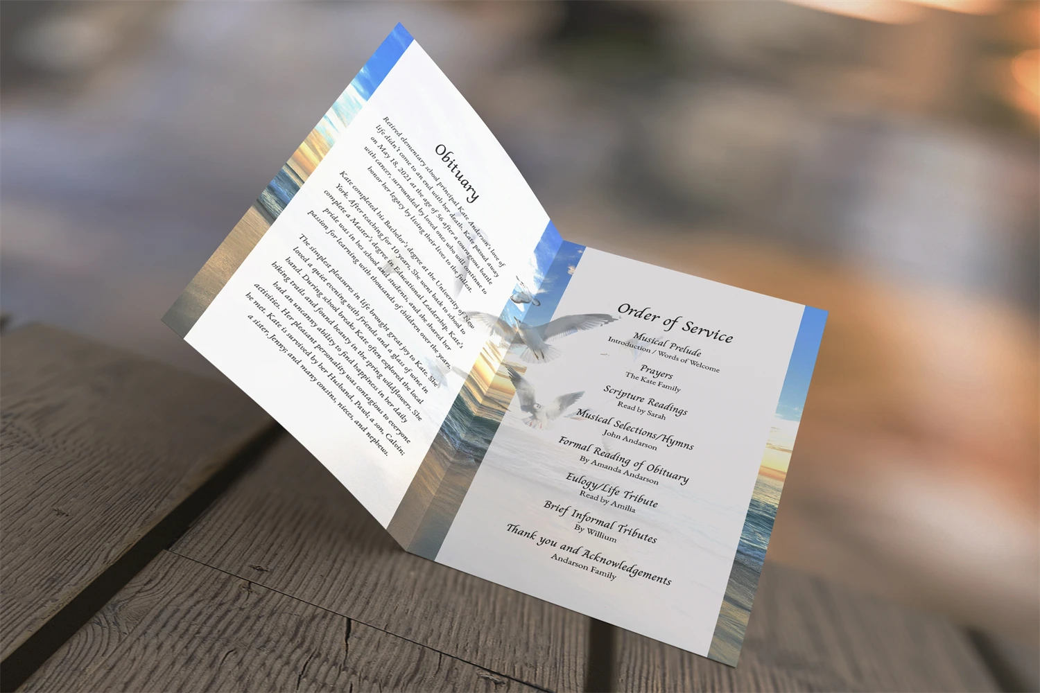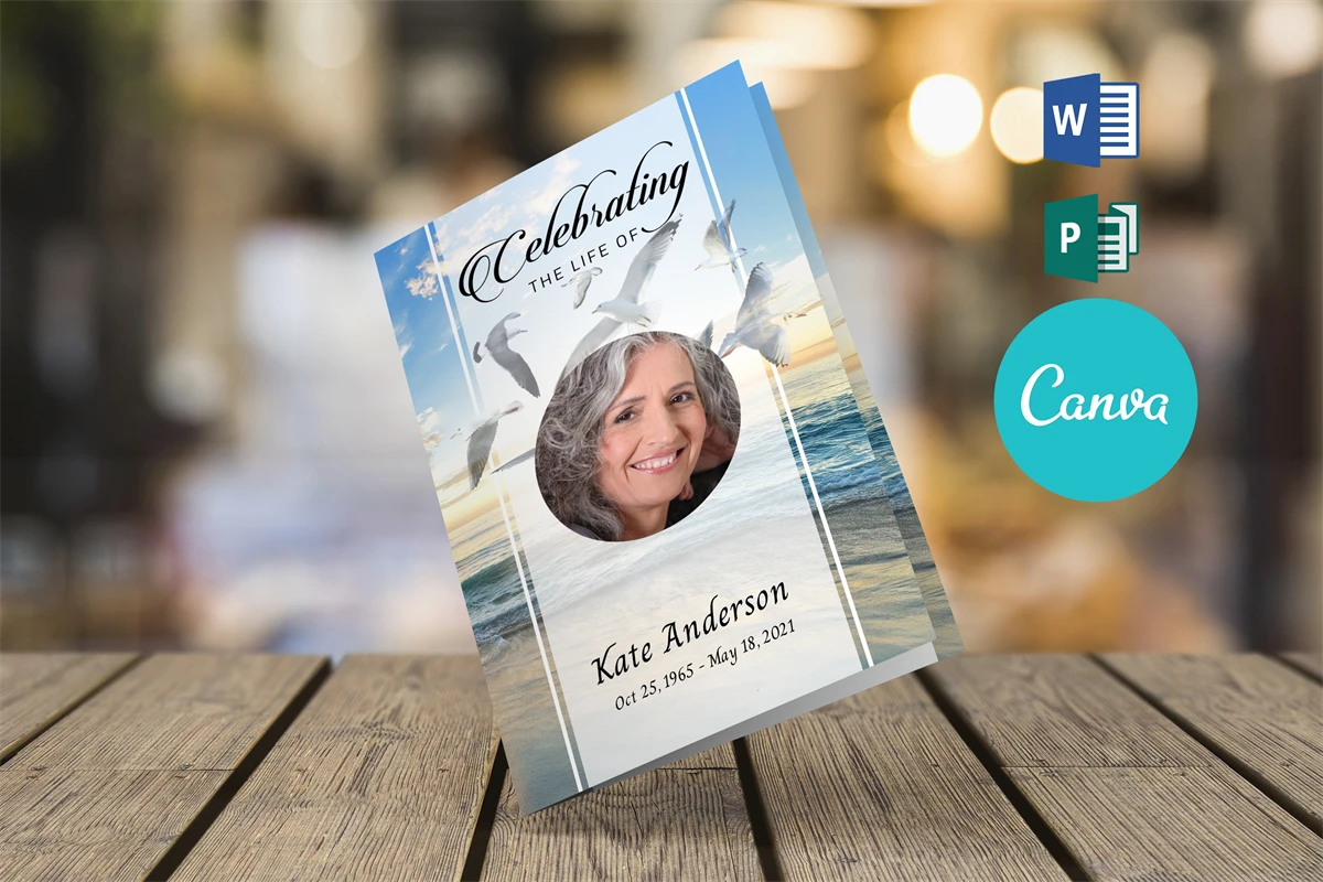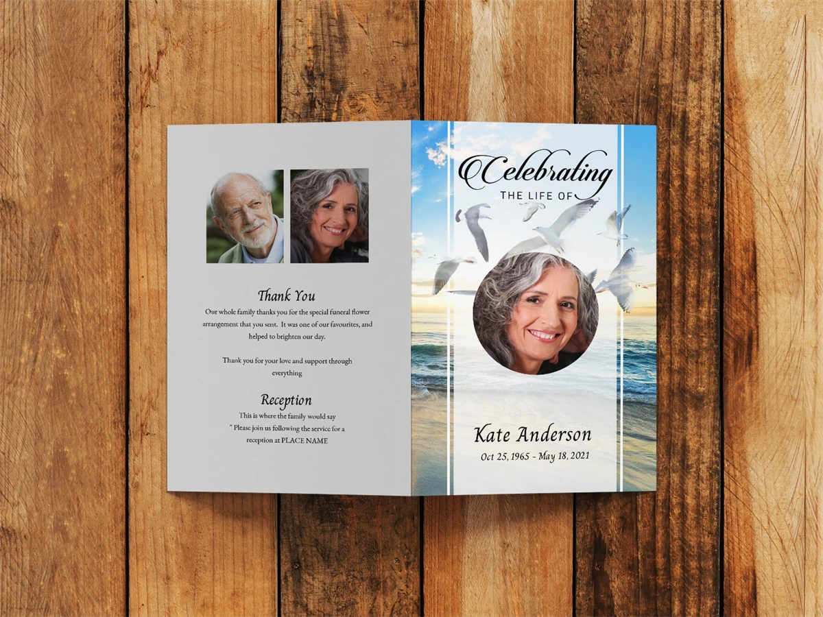 Funeral program template 4 page for women with Beach with bird Background Decoration. This template is a great way to honor your loved one.