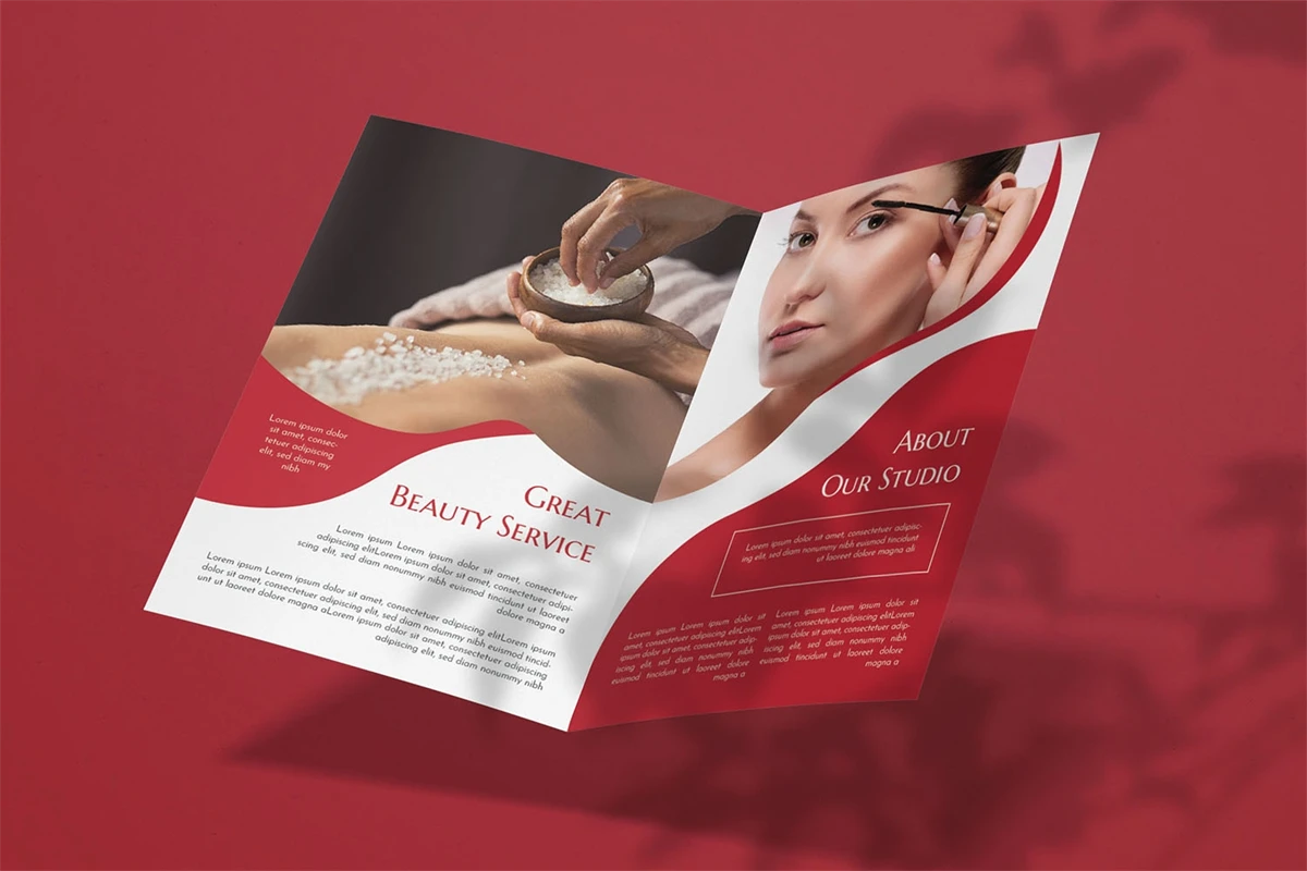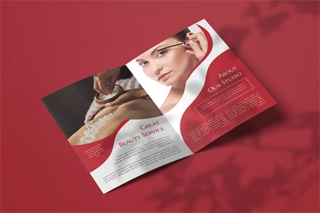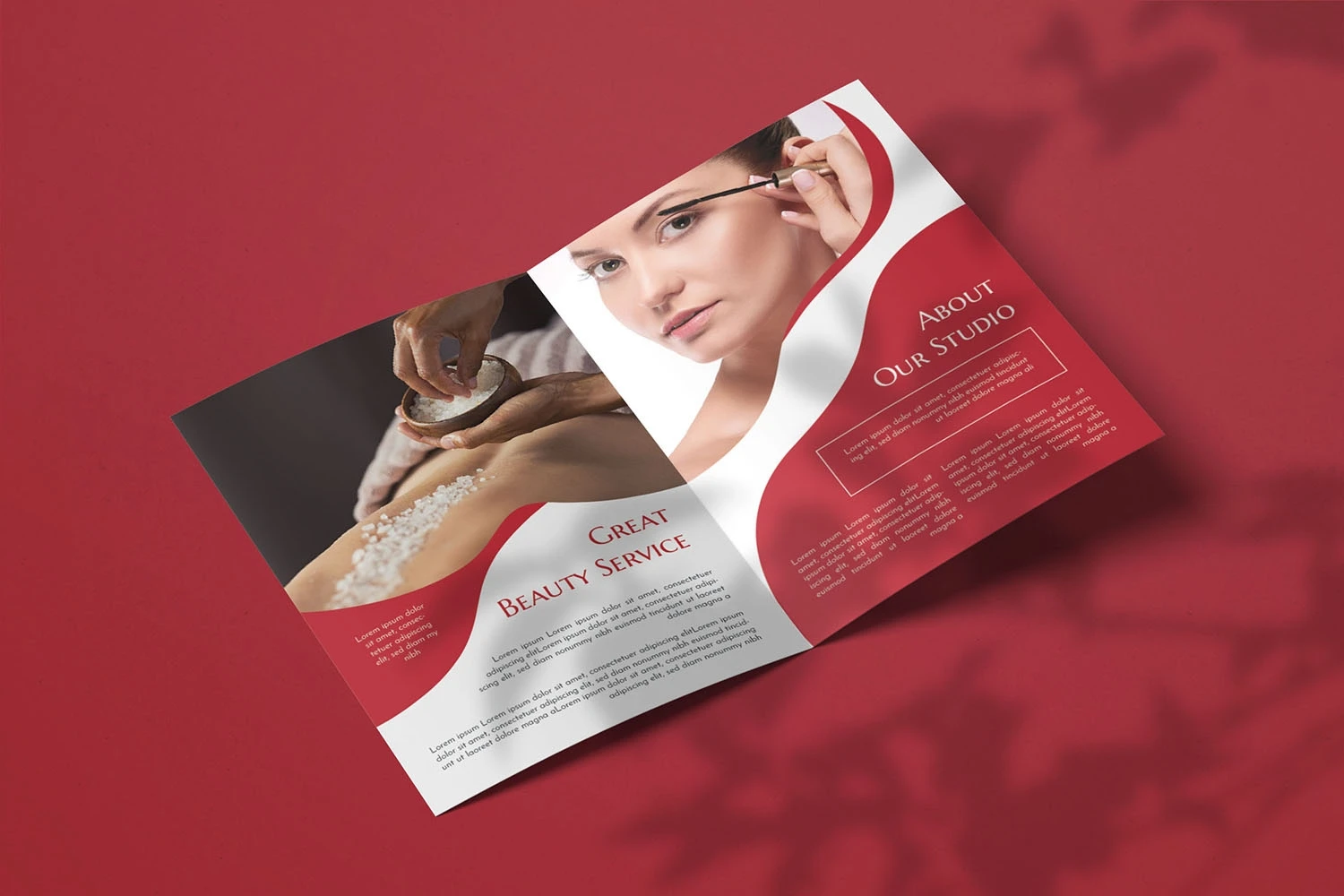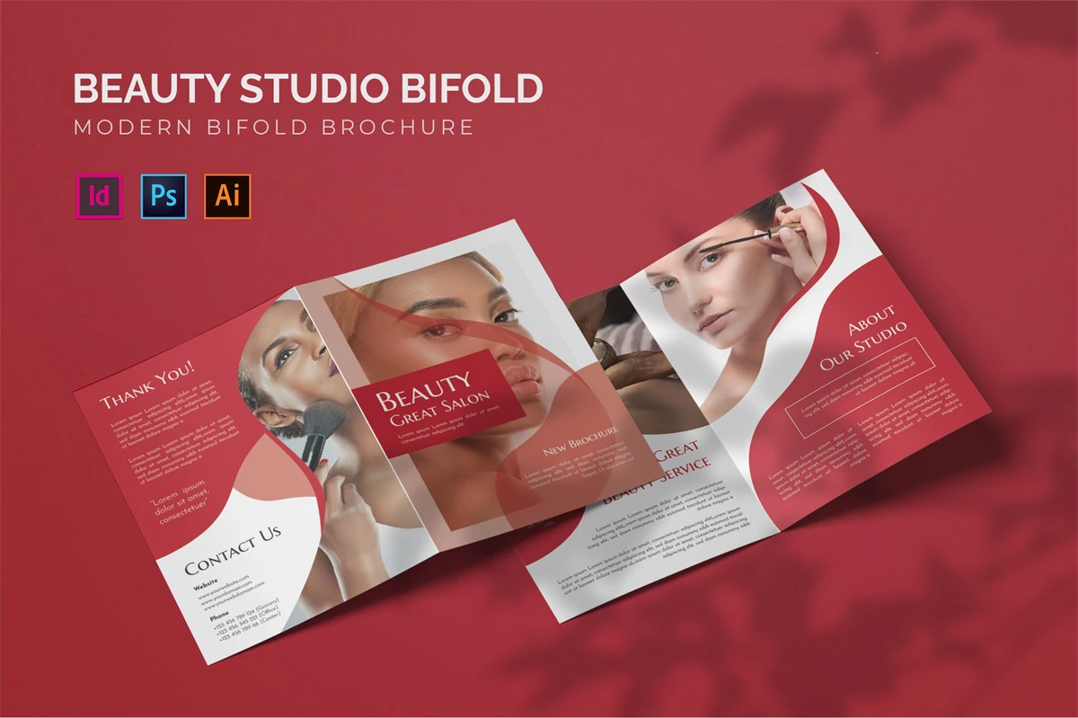 Beauty Studio - Bifold Brochure We present this Bifold Brochure for you, simple and very elegant, and this Bifold Brochure is suitable for all types of your business, made with Adobe InDesign (INDD), Adobe Photoshop (PSD) and Adobe Illustrator (AI), very easy to customize, Hope you Like it, dont forget to rate, Thanks.