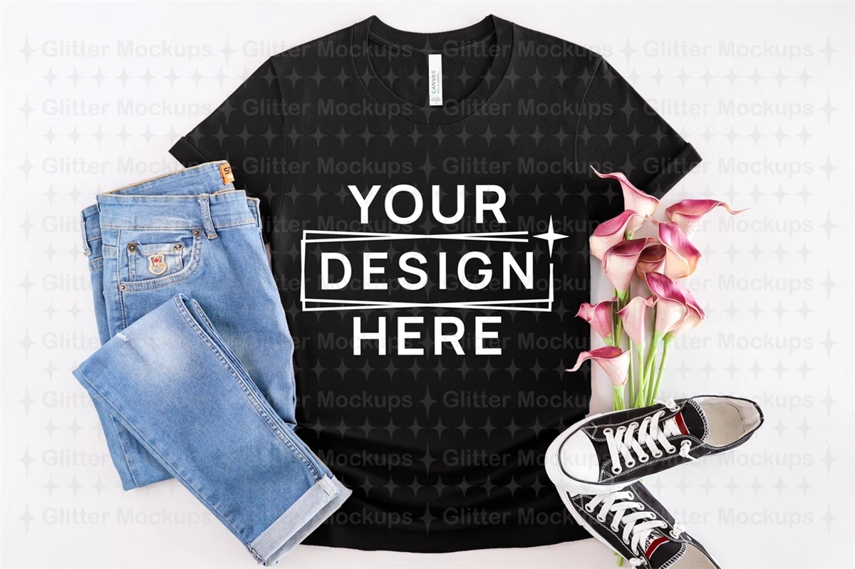 Bella Canvas 3001 Black Mockup, Unisex Tee, Styled, Flat Lay