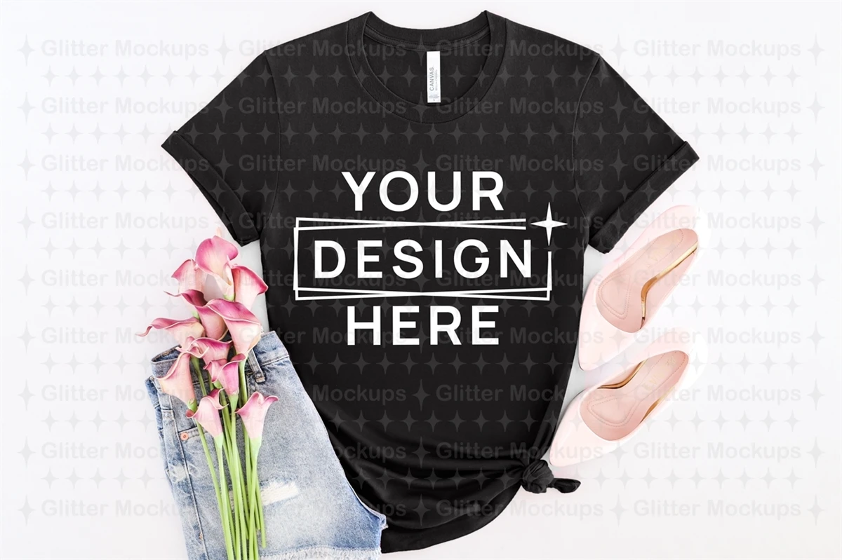 Bella Canvas 3001 Black Mockup, Women Tee, Styled, Flat Lay