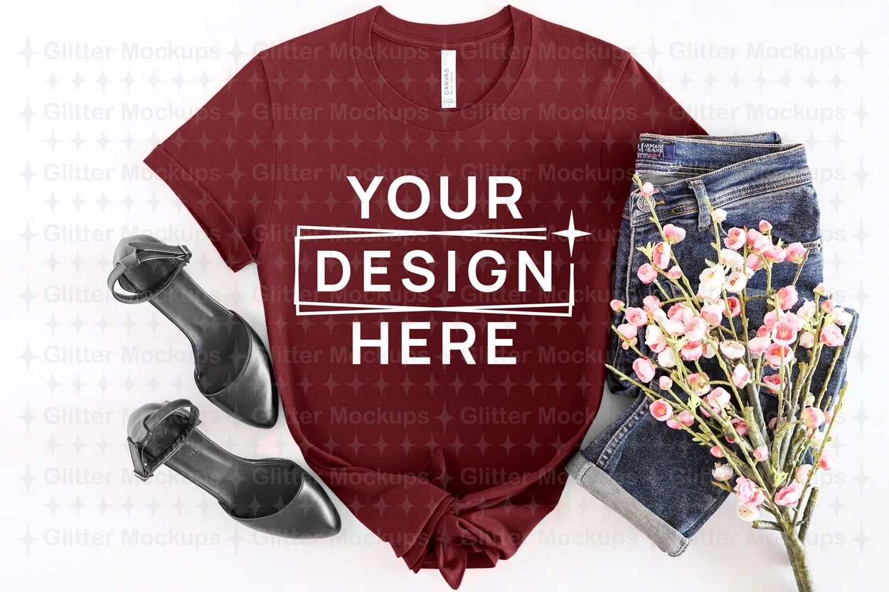 Bella Canvas 3001 Maroon Mockup, Styled Mockup, Flat Lay