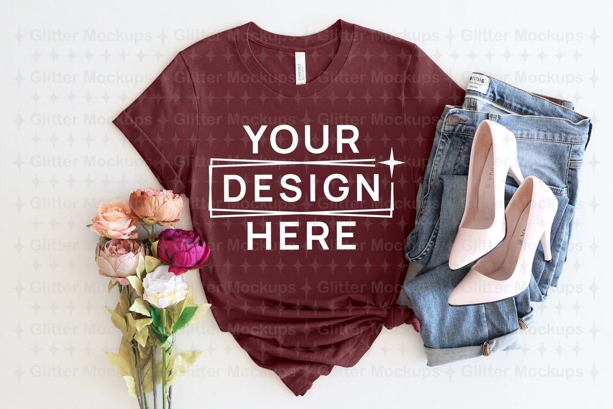 Bella Canvas 3001 Maroon Mockup, Women T-Shirt, Flat Lay