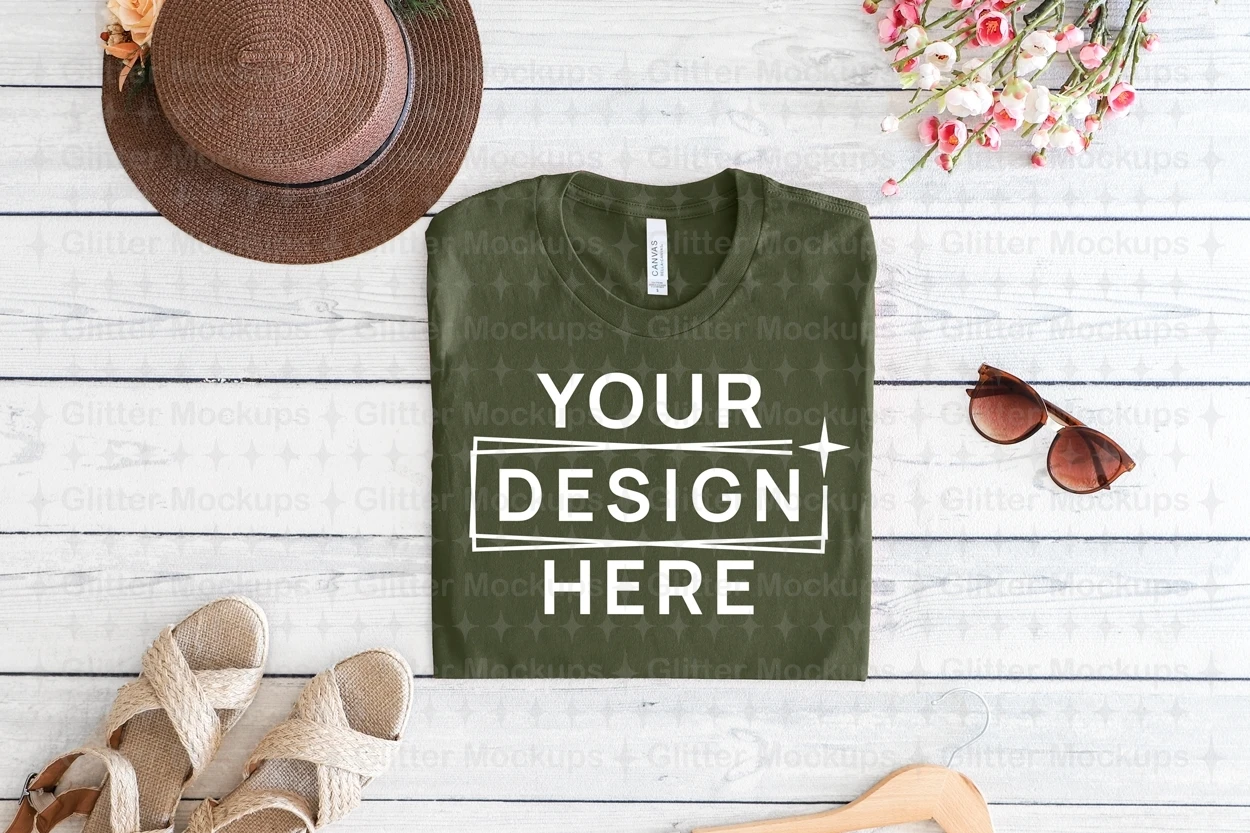 Bella Canvas 3001 Military Green Mockup, Flat Lay, Army, Png
