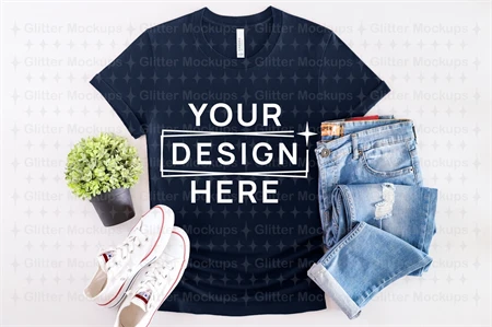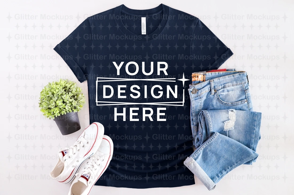 Bella Canvas 3001 Navy Mockup, Blue T-Shirt, Styled, Png