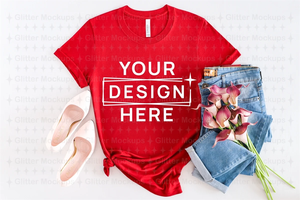 Bella Canvas 3001 Red Mockup, Women T-Shirt, Flat Lay, Png