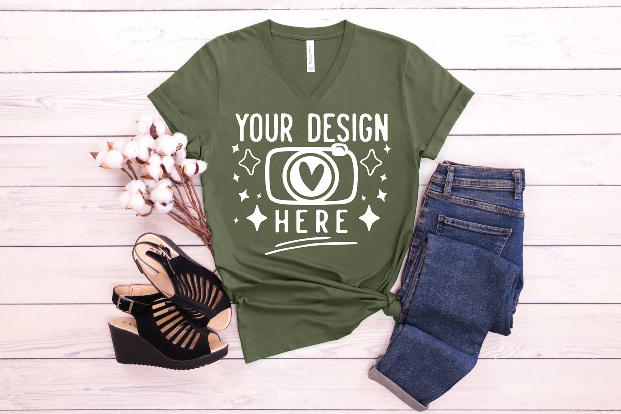 Bella Canvas 3005 Military Green V Neck Mockup, Flat Lay
