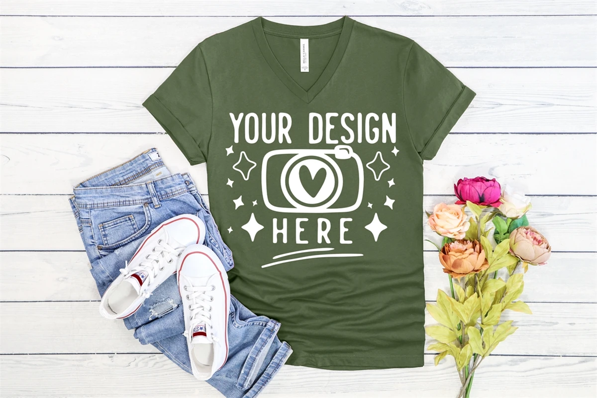 Bella Canvas 3005 Military Green V Neck Mockup, Flat Lay