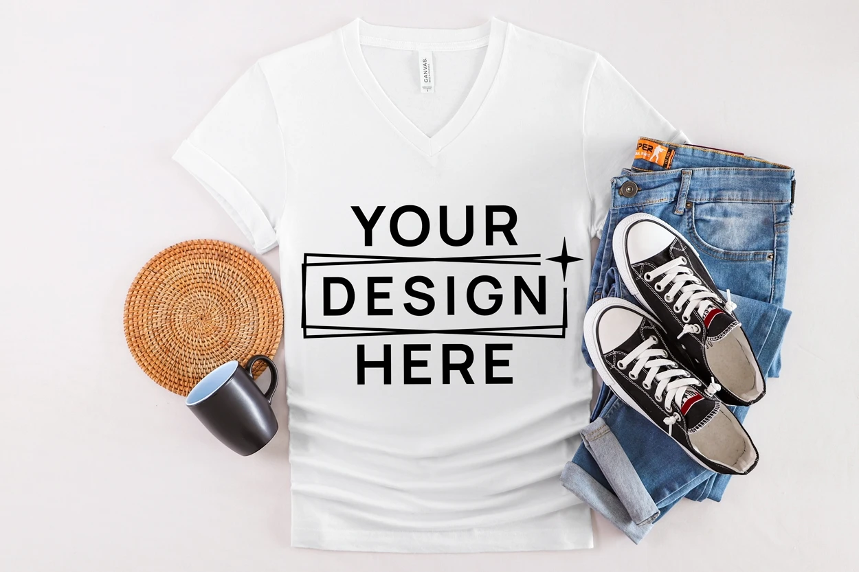 Bella Canvas 3005 White V Neck Mockup, Unisex Tee, Flat Lay
