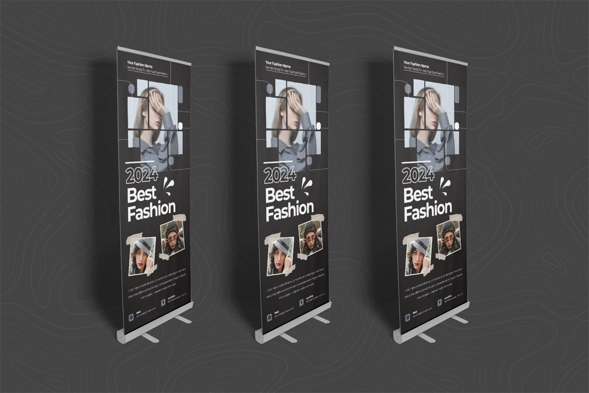 Our roll-up banner template tells your brand's story at a glance. This design stands out and can be used to showcase pictures and content effectively.