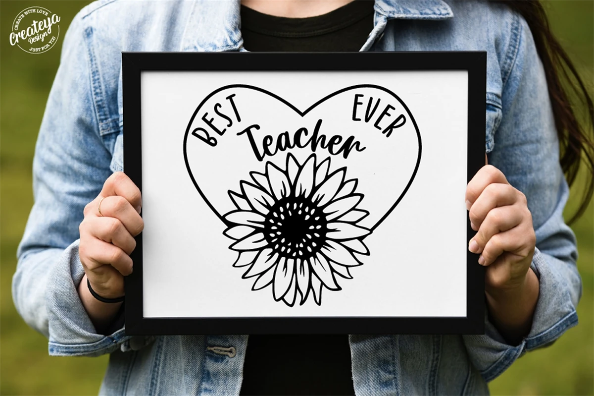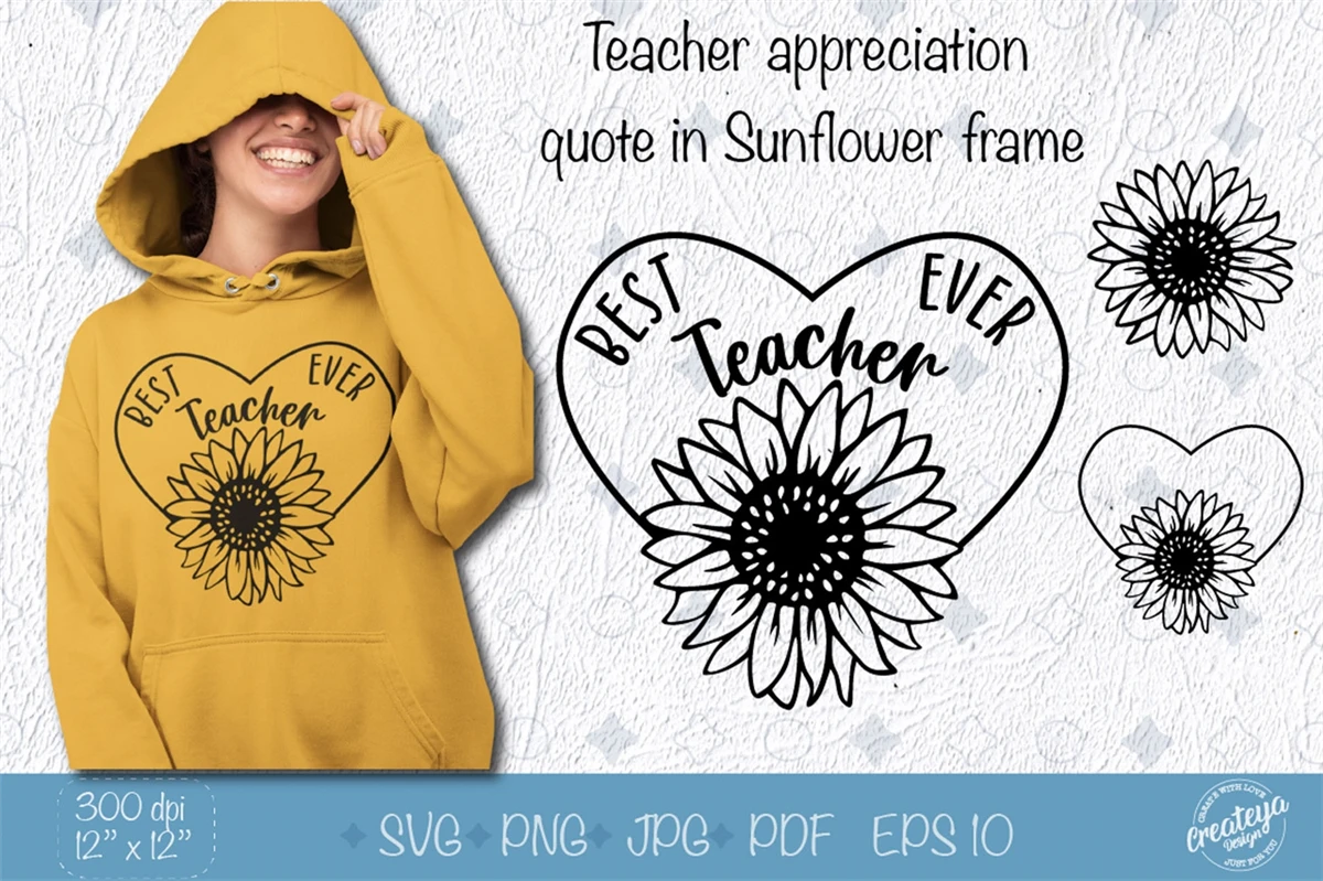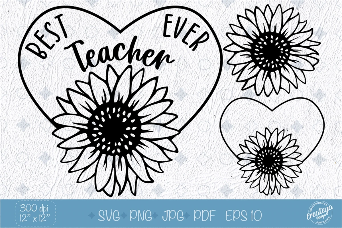 This Teacher quote SVG Best Teacher ever with Sunflower in the heart is great for teacher shirts svg mugs, bags, cards, and many more products.