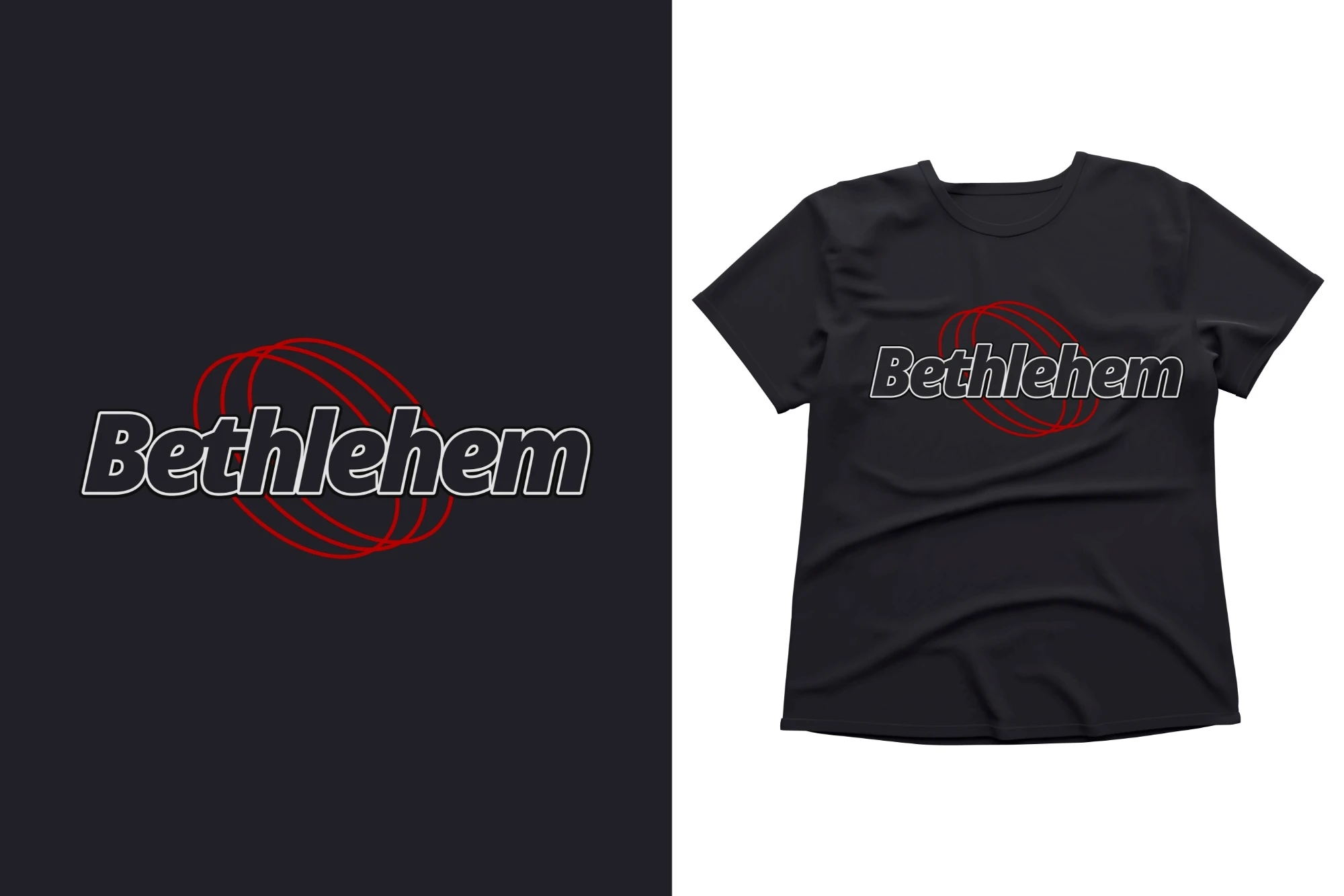 This design is a product made for you. Bethlehem; logo; t-shirt; graphic design; apparel; fashion; typography; red and black; modern design; trendy; stylish; branding; merchandise; clothing; casual wear; vector art; illustration; text art; creative; unique; custom design; print; screen print; minimalistic; bold; statement piece; graphic tee; fashion design; streetwear; urban style; contemporary; sleek; eye-catching; promotional; marketing; identity; brand identity; visual identity; design elements; artistic; wearable art; fashion statement; graphic print; design trends; fashion trends; logo design; text design; fashion graphics; apparel design; trendy wear; modern fashion; fashion logo;