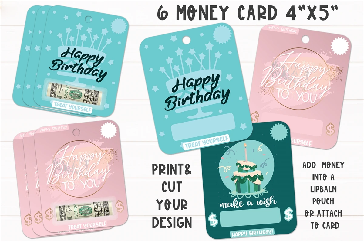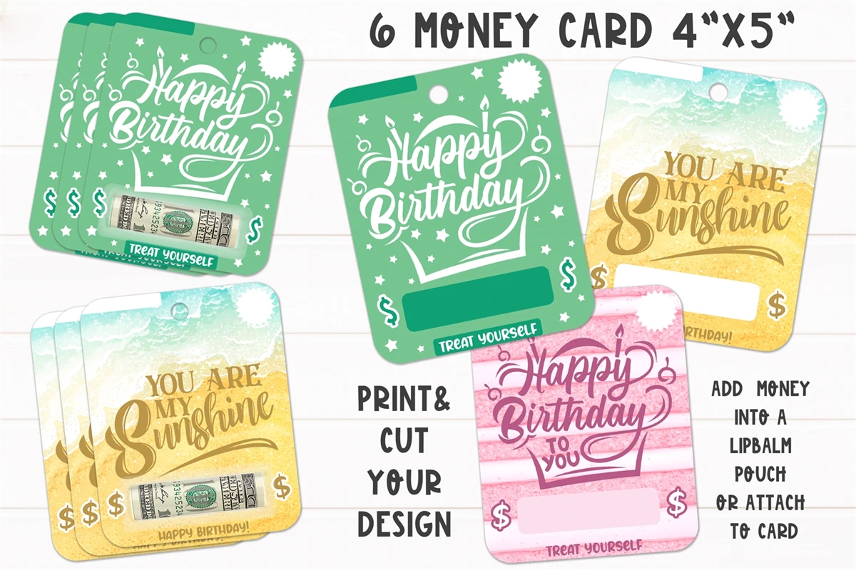 Usage: Print & cut the design you wish to use. Please remember to insert the amount of money you are going to use before printing or you can just write it down with a marker after the print was completed. Add cash to the lip palm pouch(those can be ordered from amazon) and glue it to the surface of the card on the box between the dollar signs. Gift it to your loved ones!