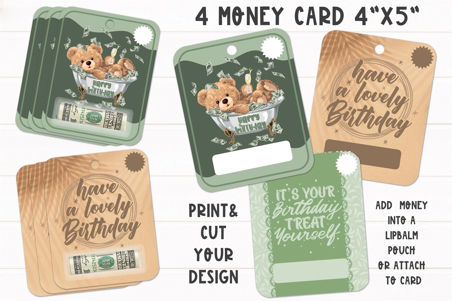 Usage: Print & cut the design you wish to use. Please remember to insert the amount of money you are going to use before printing or you can just write it down with a marker after the print was completed. Add cash to the lip palm pouch(those can be ordered from amazon) and glue it to the surface of the card on the box between the dollar signs. Gift it to your loved ones!