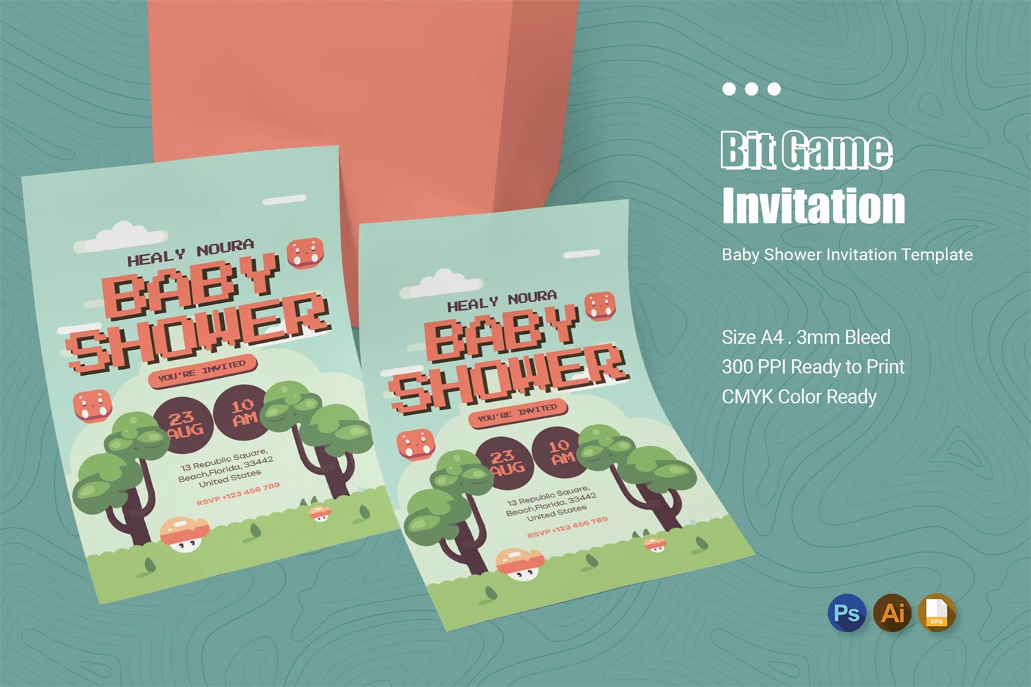 This baby shower invitation card template makes your invitation card look enjoyable, professional, and also simple. It's perfect for parents who want to celebrate the birth of their baby. You can easily to customize to your needs if using **illustrator** you just need to Drag your Image, select the image and placeholder, then right click select Make