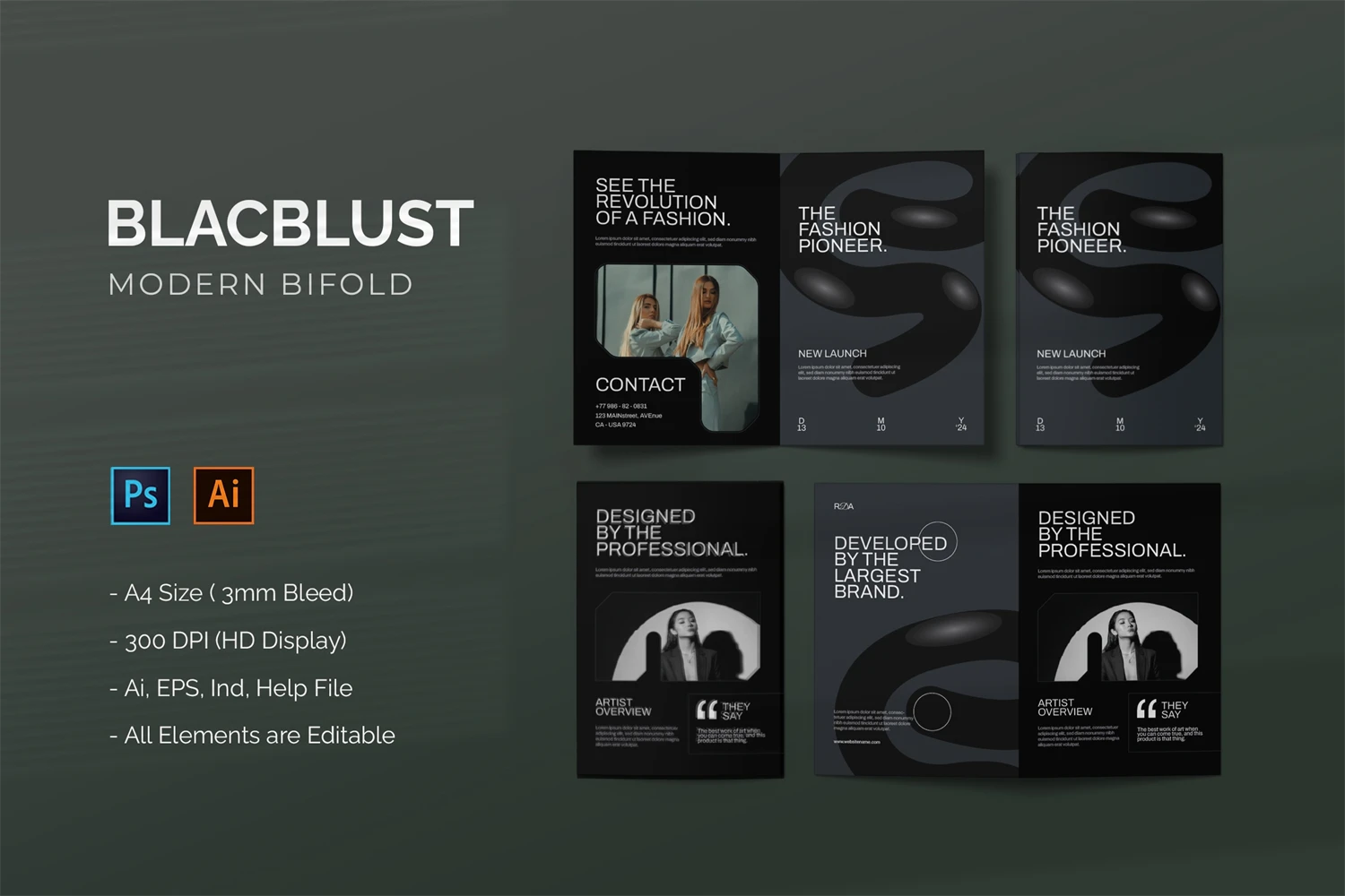 Blacblust - Bifold Brochure This bifold brochure design template offers a visually engaging canvas to showcase your message, products, or services. With a well-organized layout and attention-grabbing graphics, each panel tells a part of your story.