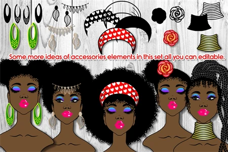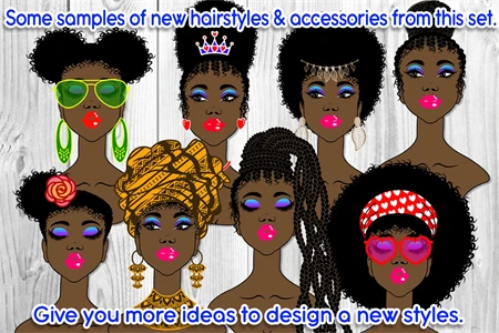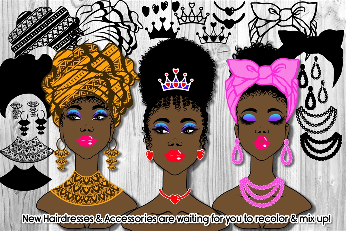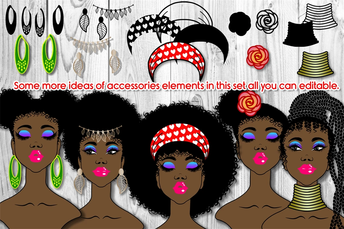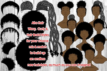 African-American Black Girl Version with Afro, Curly Hairstyles and Hair Accessories Set Silhouette Clipart Design Elements for your creative DIY projects, and Home Decorations. Perfect for vinyl, personalized T-shirts, apparel, cups, stickers, card stock, and other DIY projects. Options are endless!