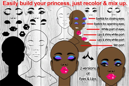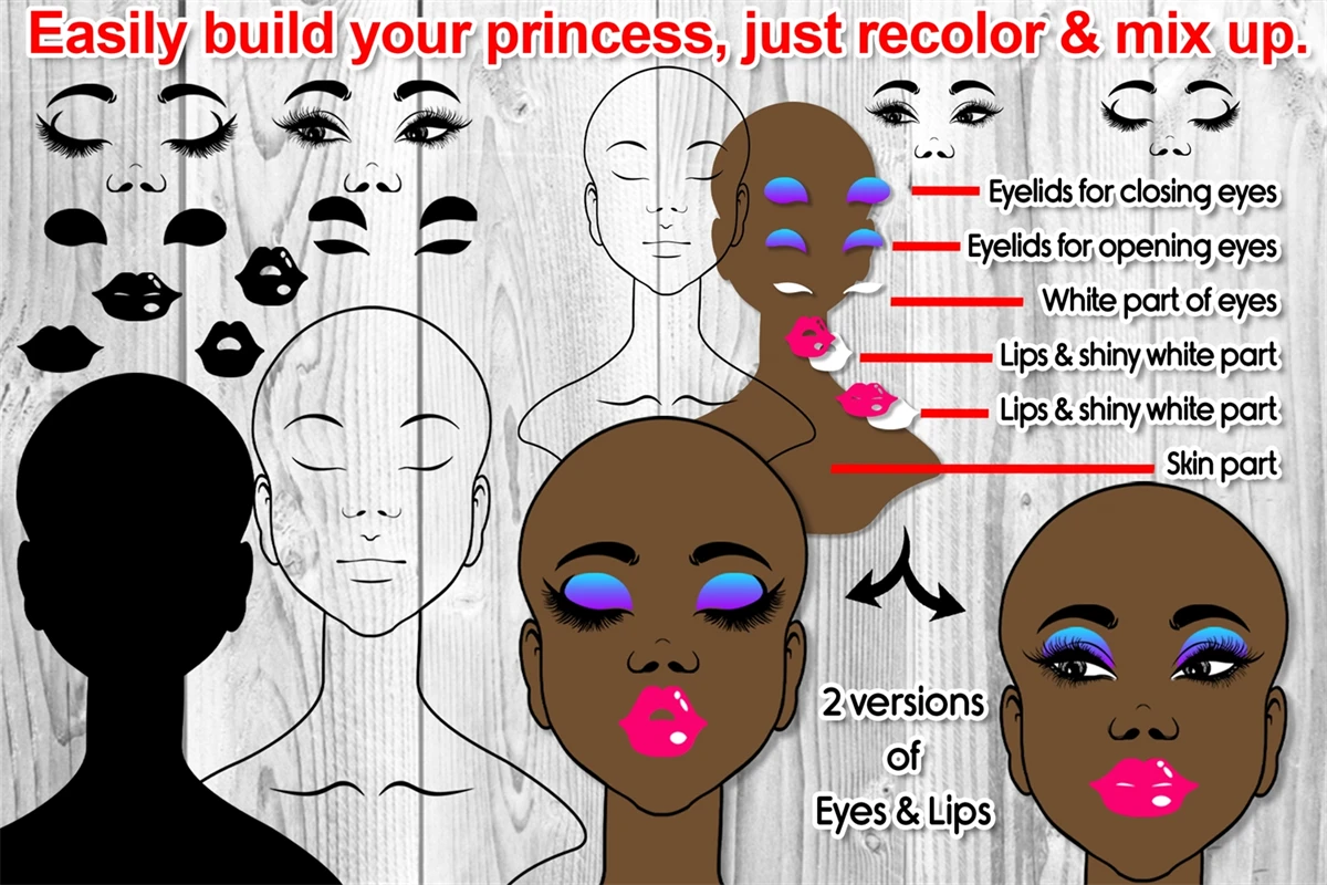 The design comes in BLACK color which can be easily changed to your desired color. Easily build your own style princess by just recolor, put together respectively as layered style clipart.