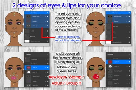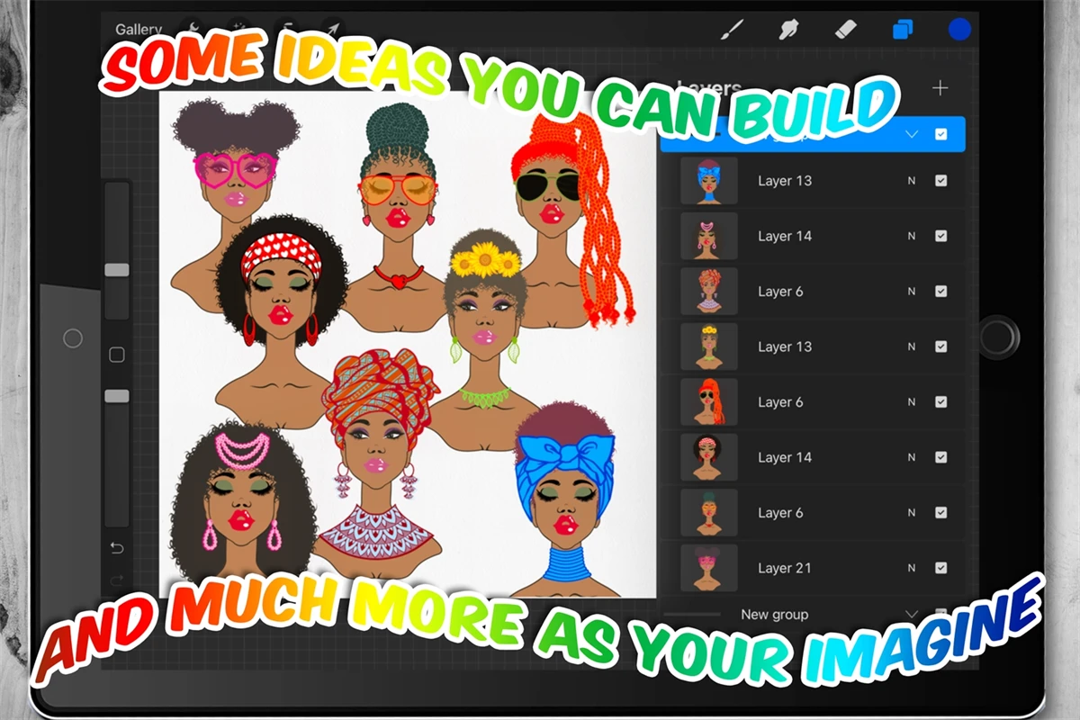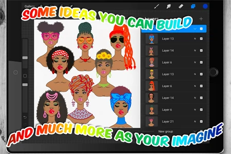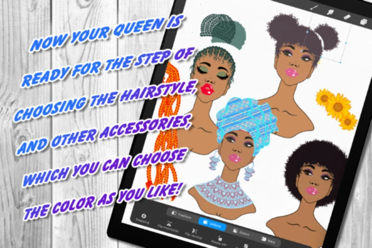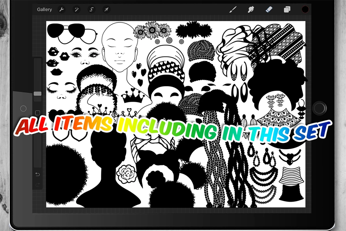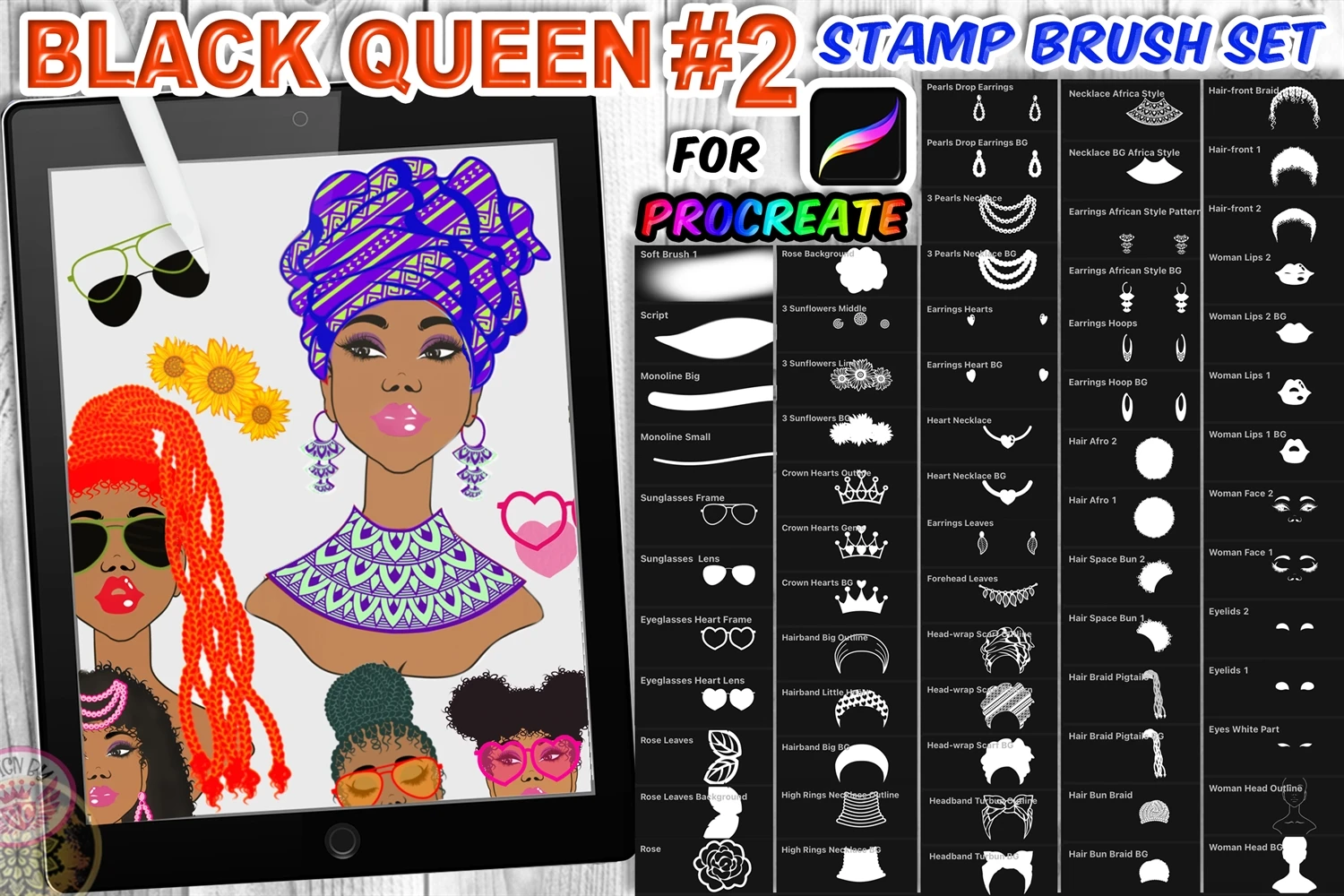 This collection includes various elements of Black Queen V.2 Afro Braid Turban African Hairstyle Procreate Stamp Brush Set for Creative DIY Projects. These are 62 stamp brushes for the Procreate app.