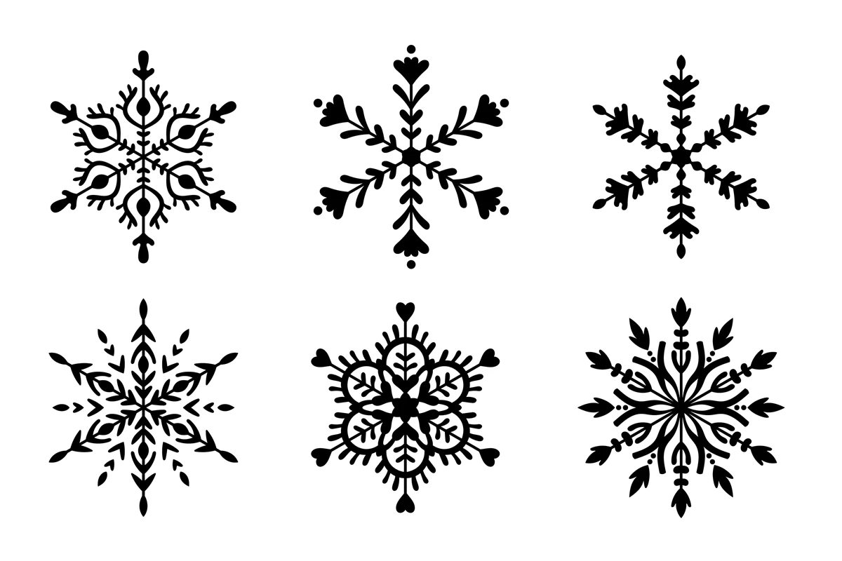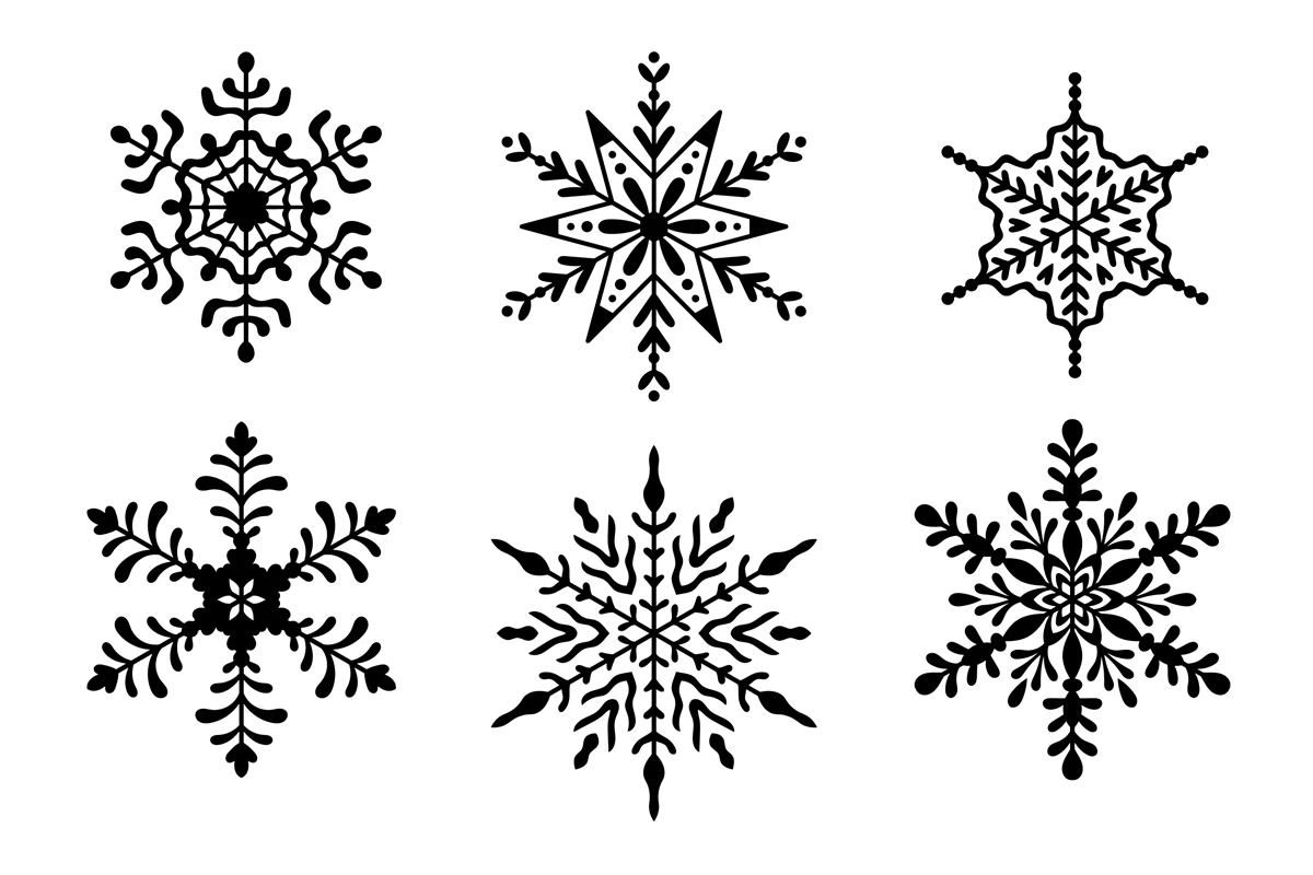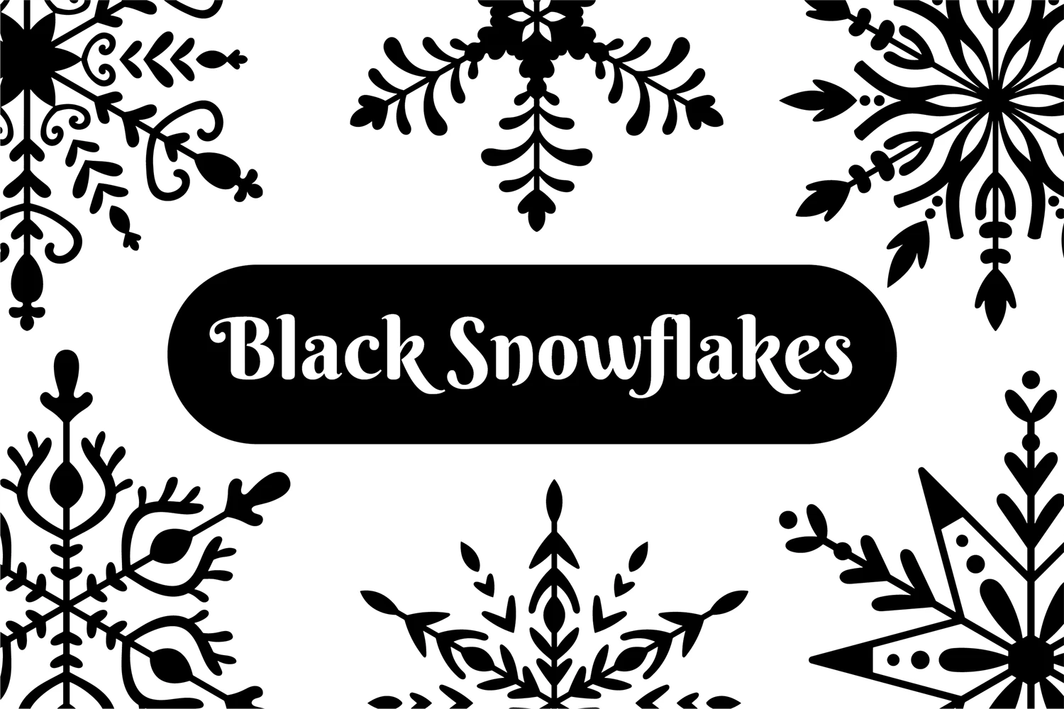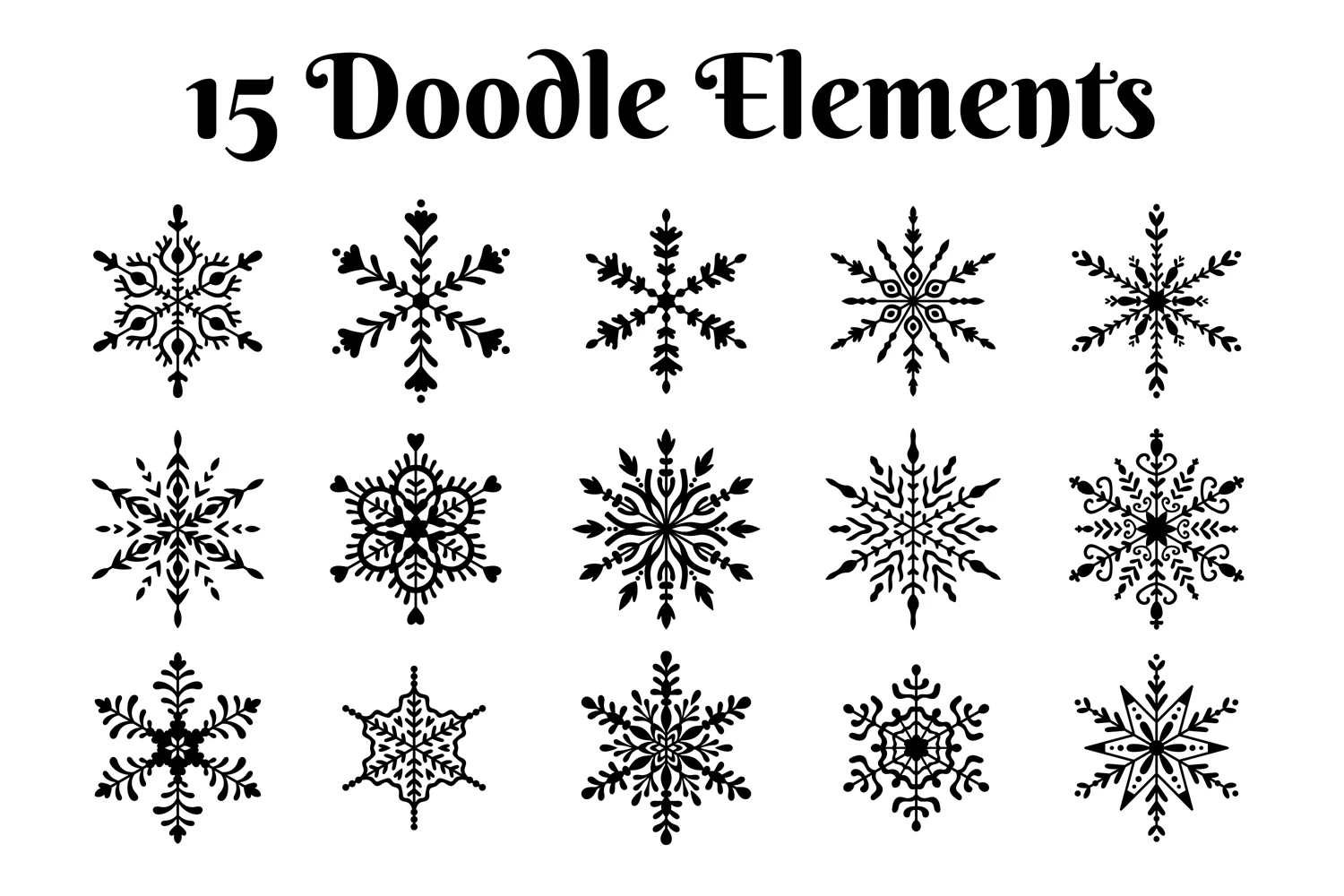 Decorative black snowflakes collection in doodle style includes 15 elements for winter season, greeting cards, posters, sublimation, t shirt, prints, mug, pillow, tote bad, holidays, Christmas design. Winter snowflakes bundle. Christmas holiday png design.