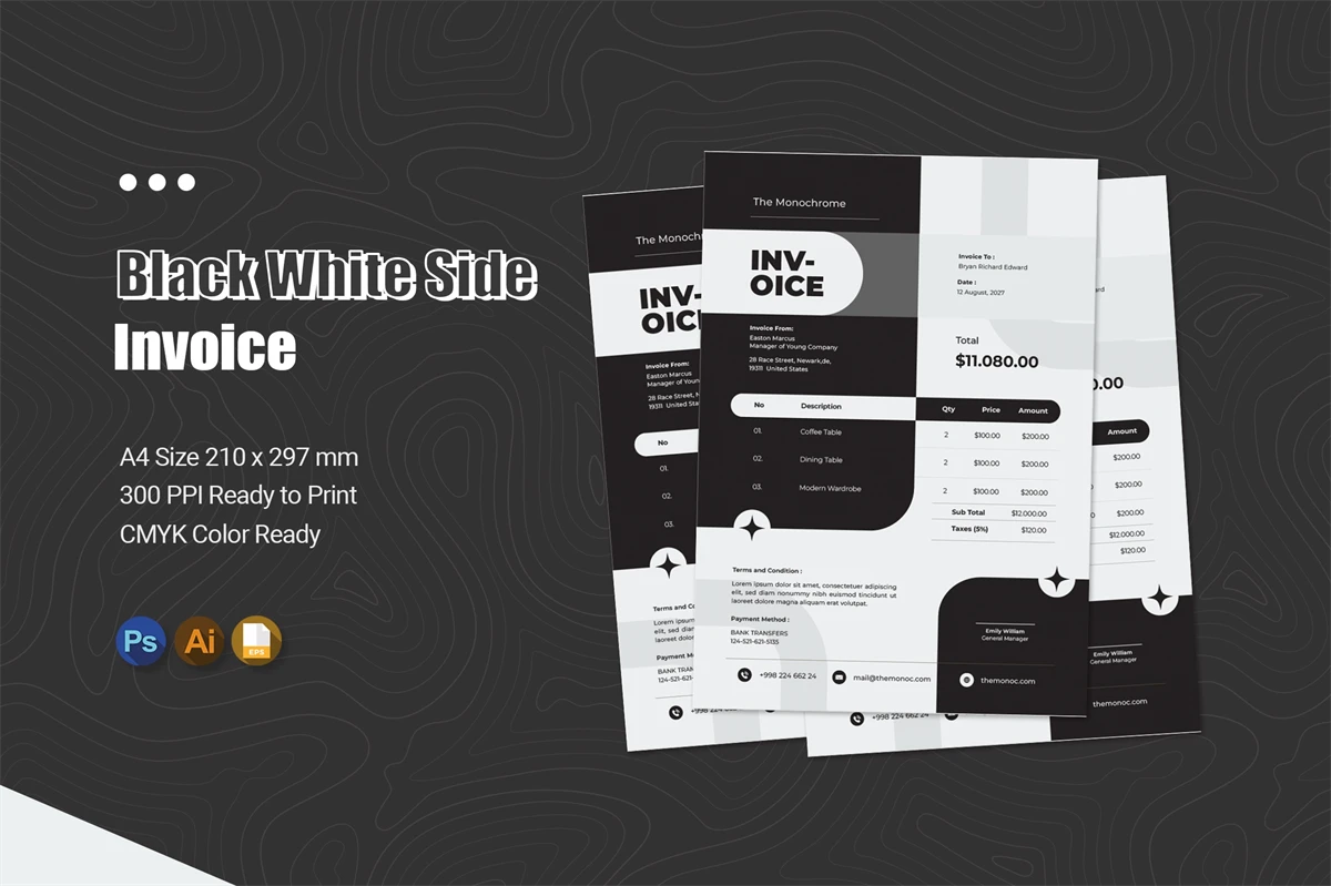 Use our invoices to make your bookkeeping easier and to impress your clients with an invoice display that has a modern, elegant design and strong typography. This invoice template is easy to use and customizable, making it perfect for any medium.