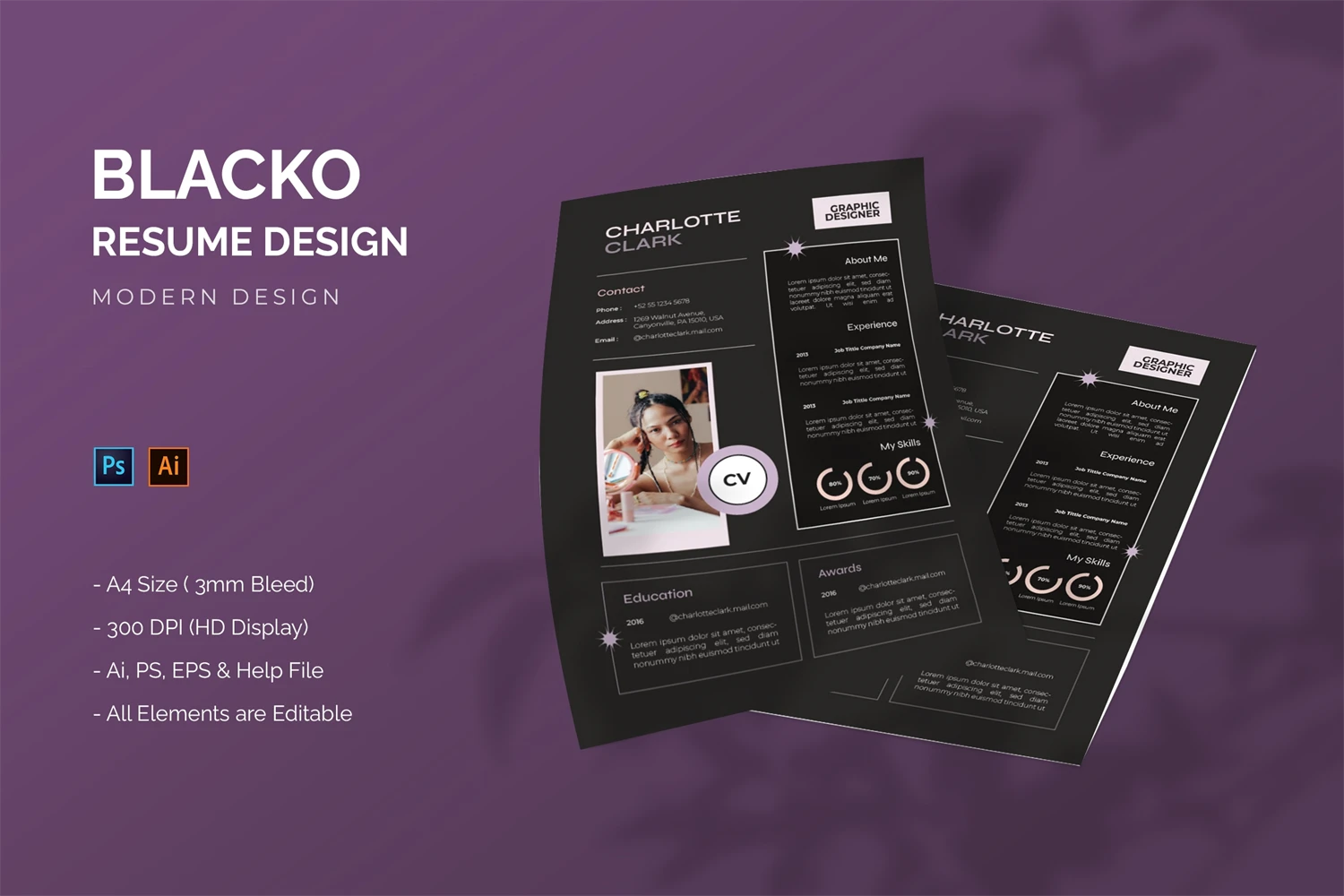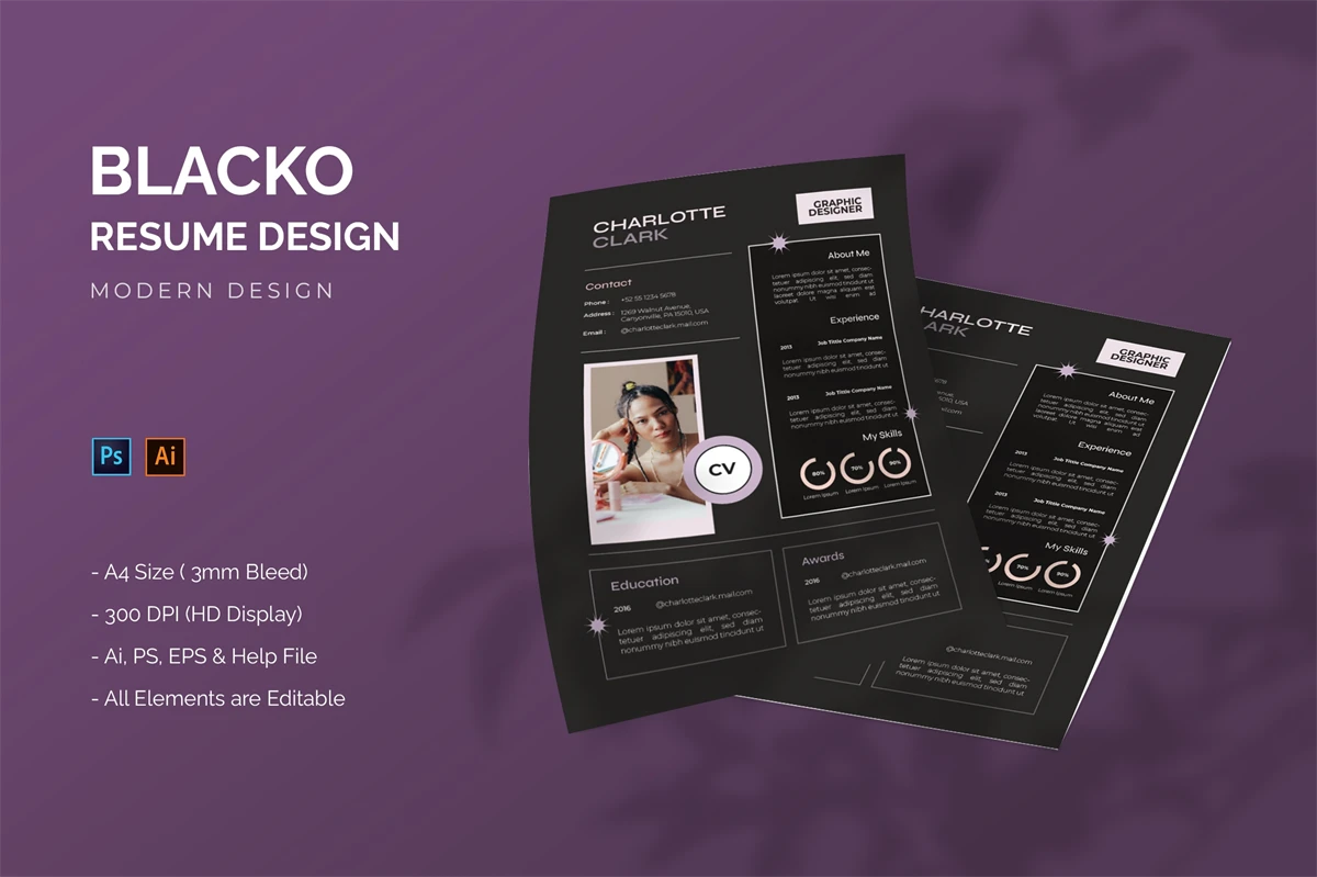 This is **Blacko - Resume Template** Get it now!, CV Resume for All business and personal needs. This design is great for your business and will make your interest, elegant, and easily editable according to your needs (**Adobe Illustrator, Adobe Photoshop**). You can use this CV Resume for personal purposes, or company purposes, I hope you enjoy this, Hope you Like it, and dont forget to rate it, Thanks.