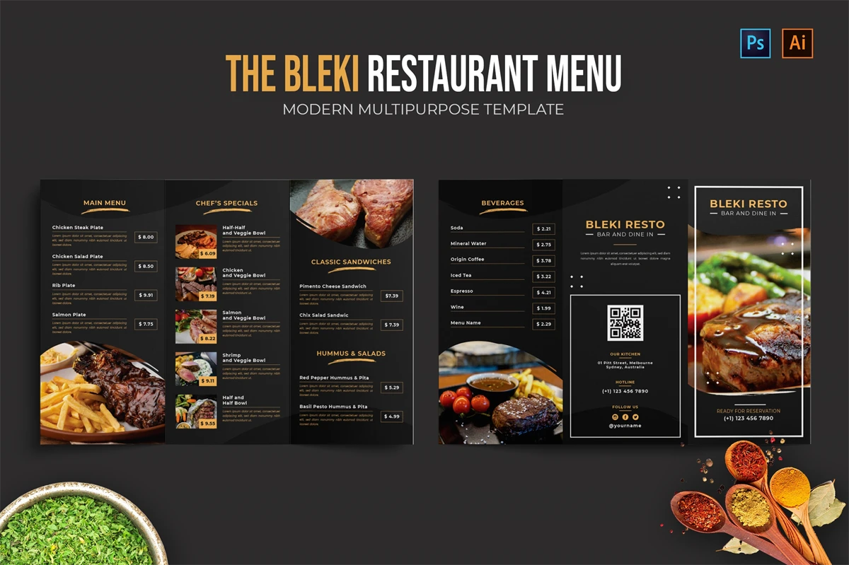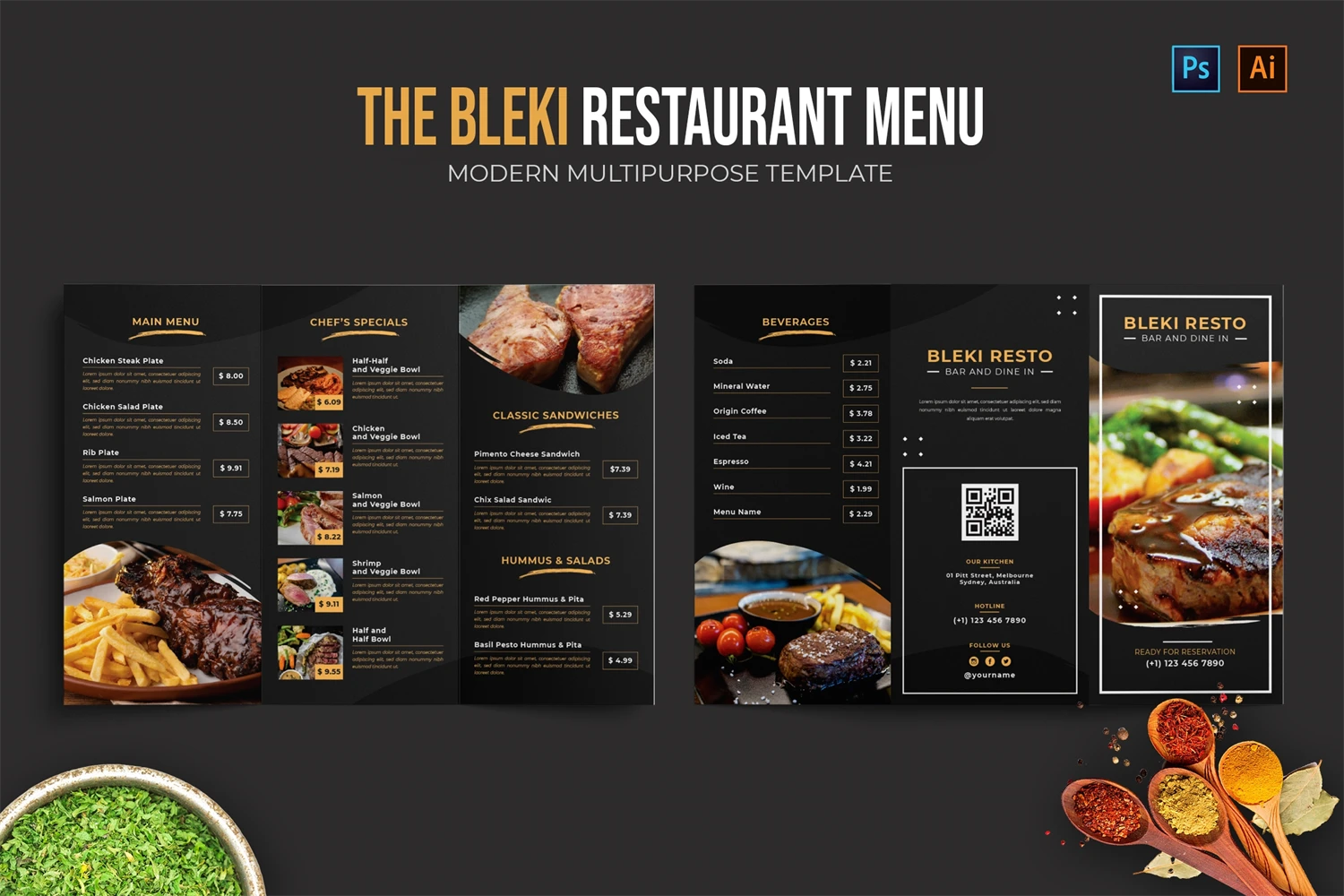 Bleki - Restaurant Menu. This template is great for your business and will make your customers interested, elegant, and easily editable according to your needs, this restaurant menu is perfect for, promos, cafes, hotels, resort shops online. etc. I hope you enjoy this restaurant menu