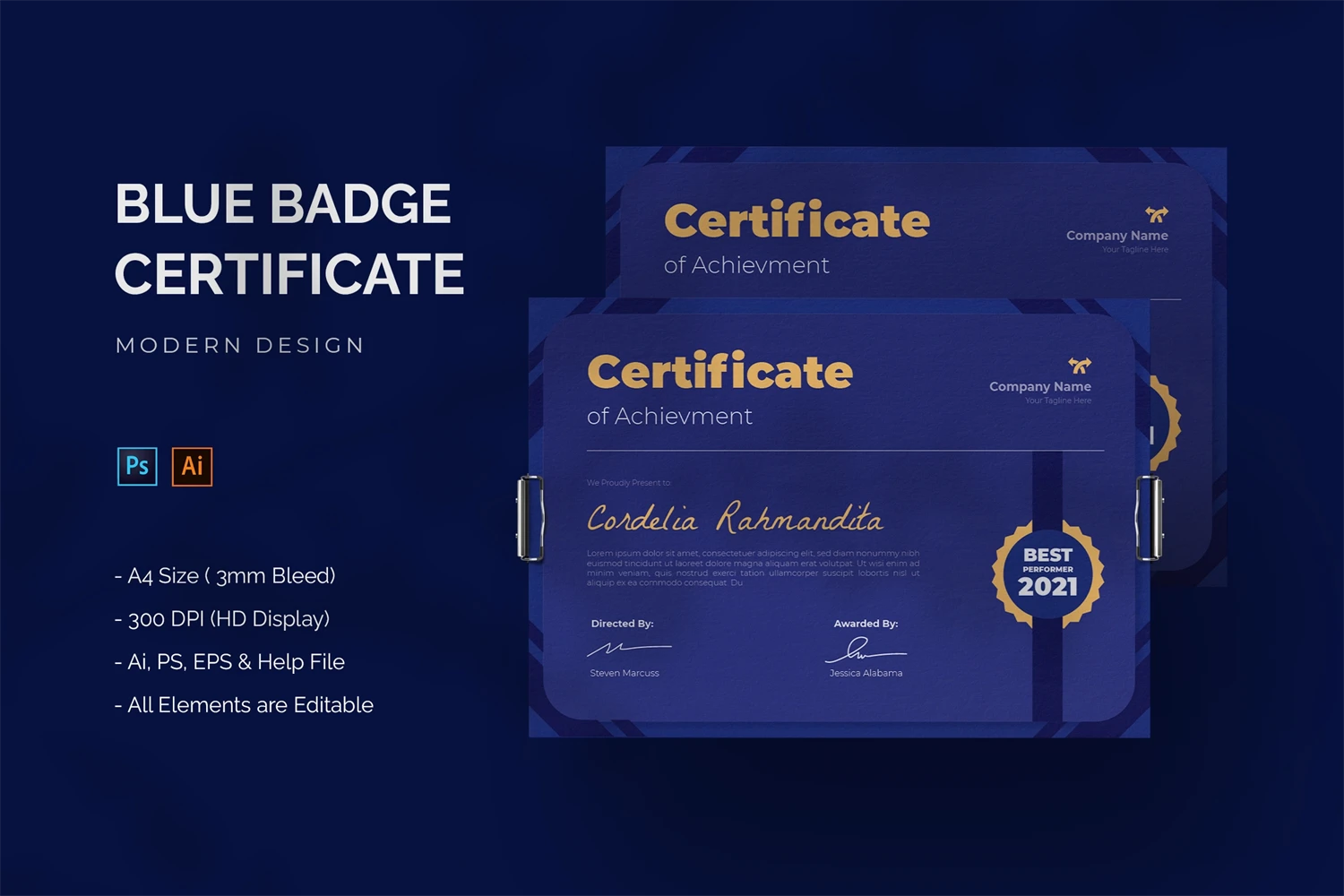 This is Blue Badge - Certificate Get it now!, This very professional, easy to edit, can be customized to your needs,(Adobe Illustrator,Adobe Photoshop). You can use this certificate for awards, seminars, training, tournaments, I hope you enjoy for this, Hope you Like it dont forget to rate, Thanks.