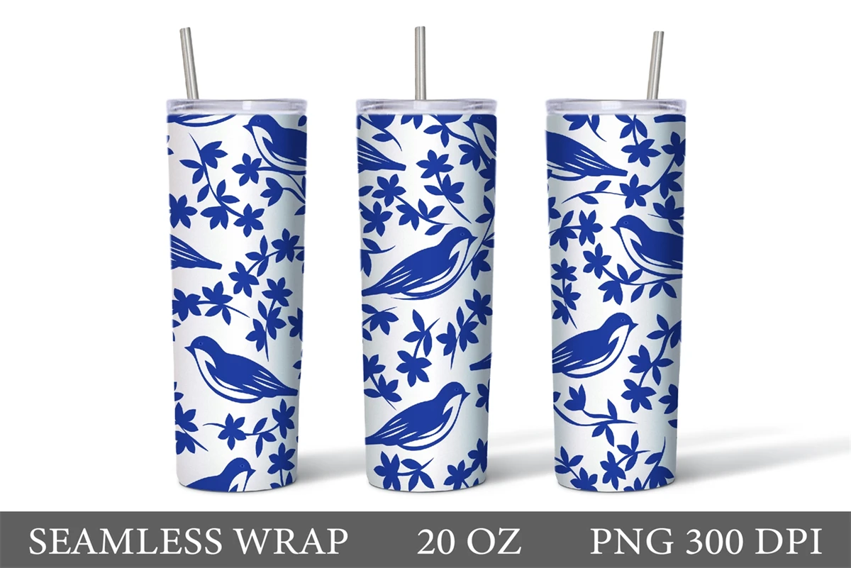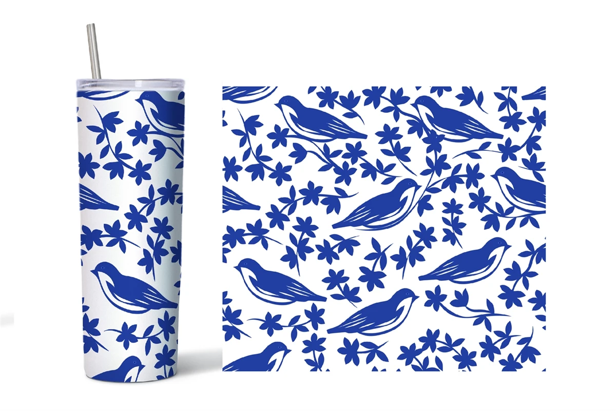 Blue bird and flowers Tumbler Wrap. Blue and White Tumbler