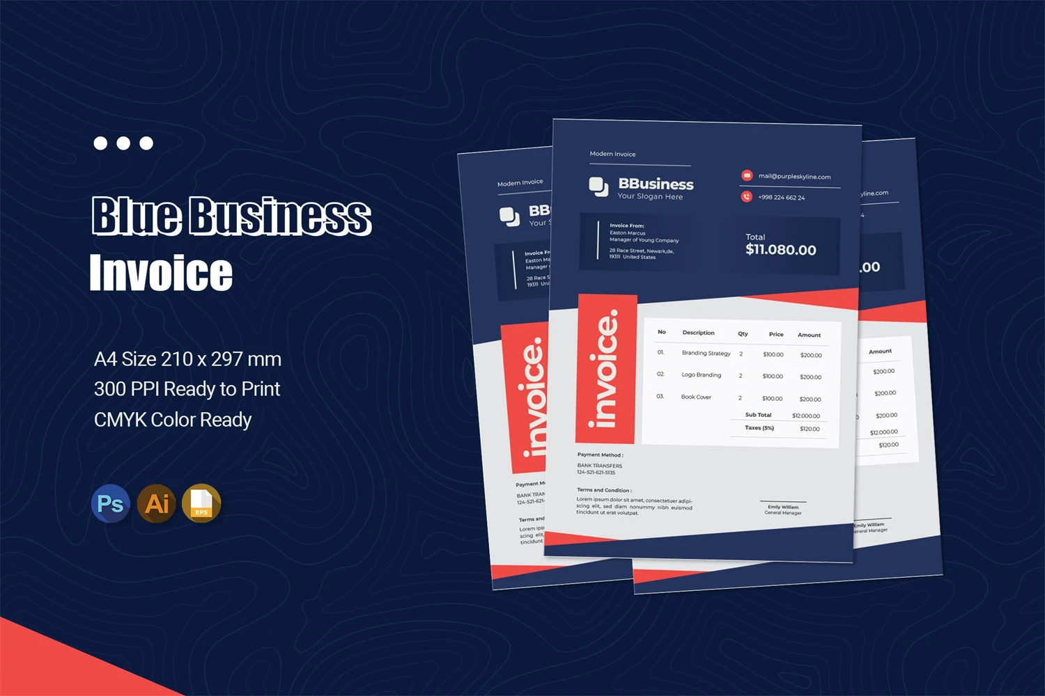 Use our invoices to make your bookkeeping easier and to impress your clients with an invoice display that has a modern, elegant design and strong typography. This invoice template is easy to use and customizable, making it perfect for any medium.