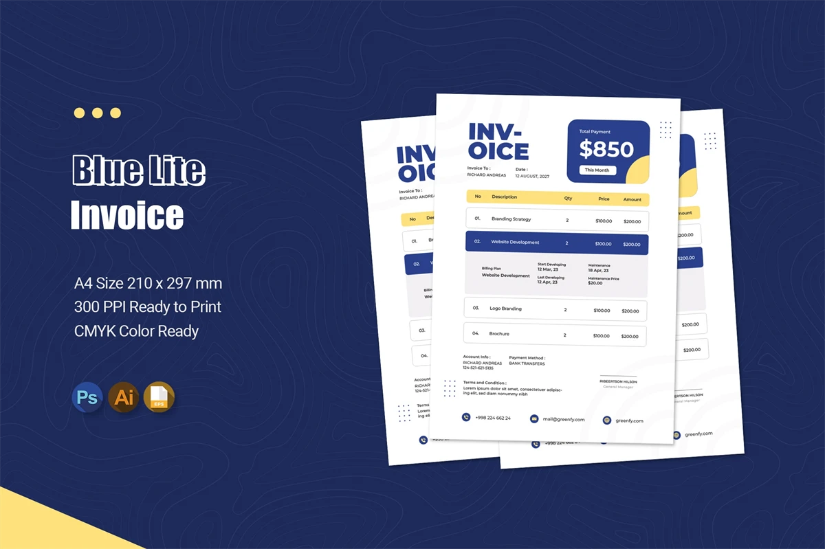 Use our invoices to make your bookkeeping easier and to impress your clients with an invoice display that has a modern, elegant design and strong typography. This invoice template is easy to use and customizable, making it perfect for any medium.