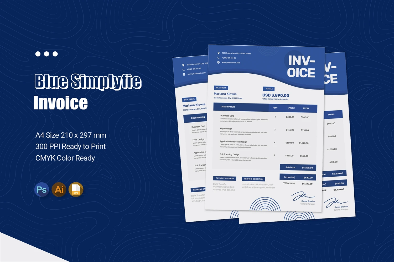 Use our invoices to make your bookkeeping easier and to impress your clients with an invoice display that has a modern, elegant design and strong typography. This invoice template is easy to use and customizable, making it perfect for any medium.