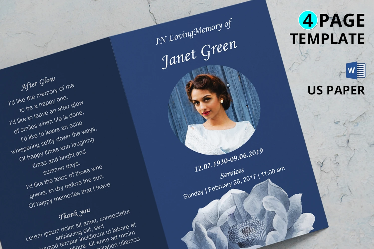 8.5x11 Inches Word, Publisher and CANVA Funeral Program Template.