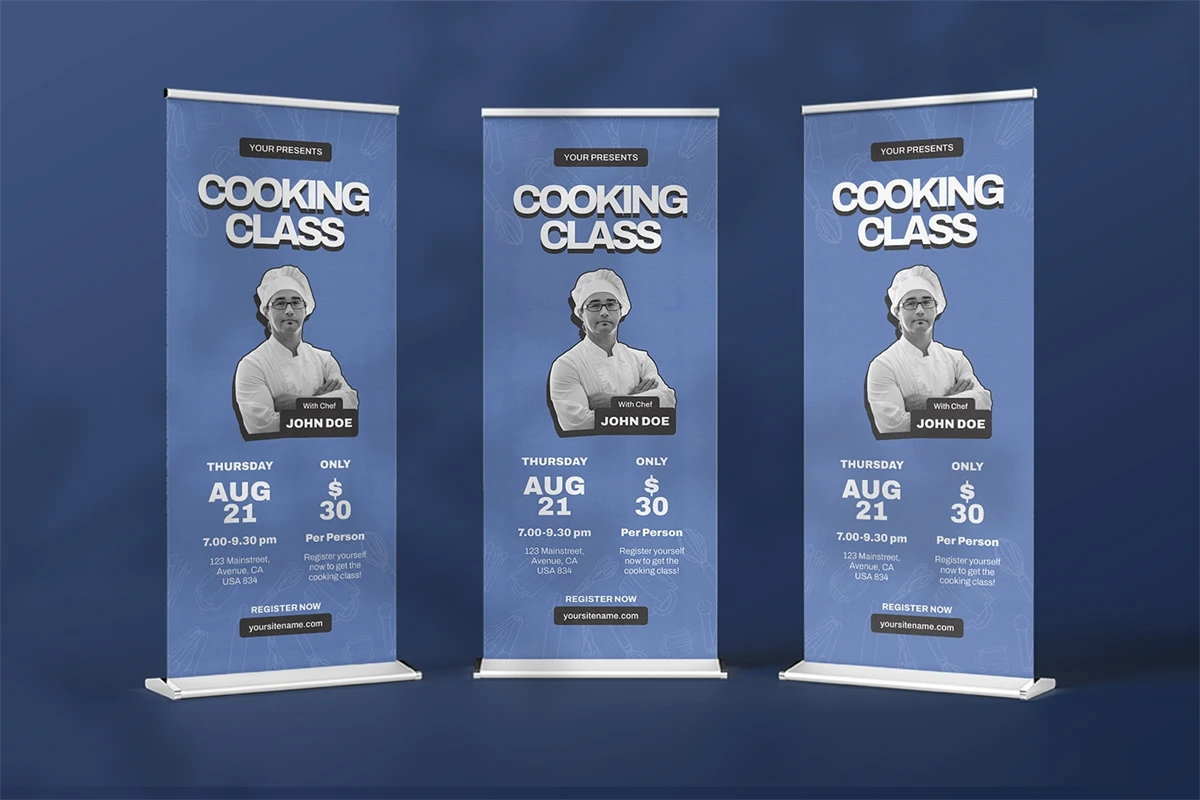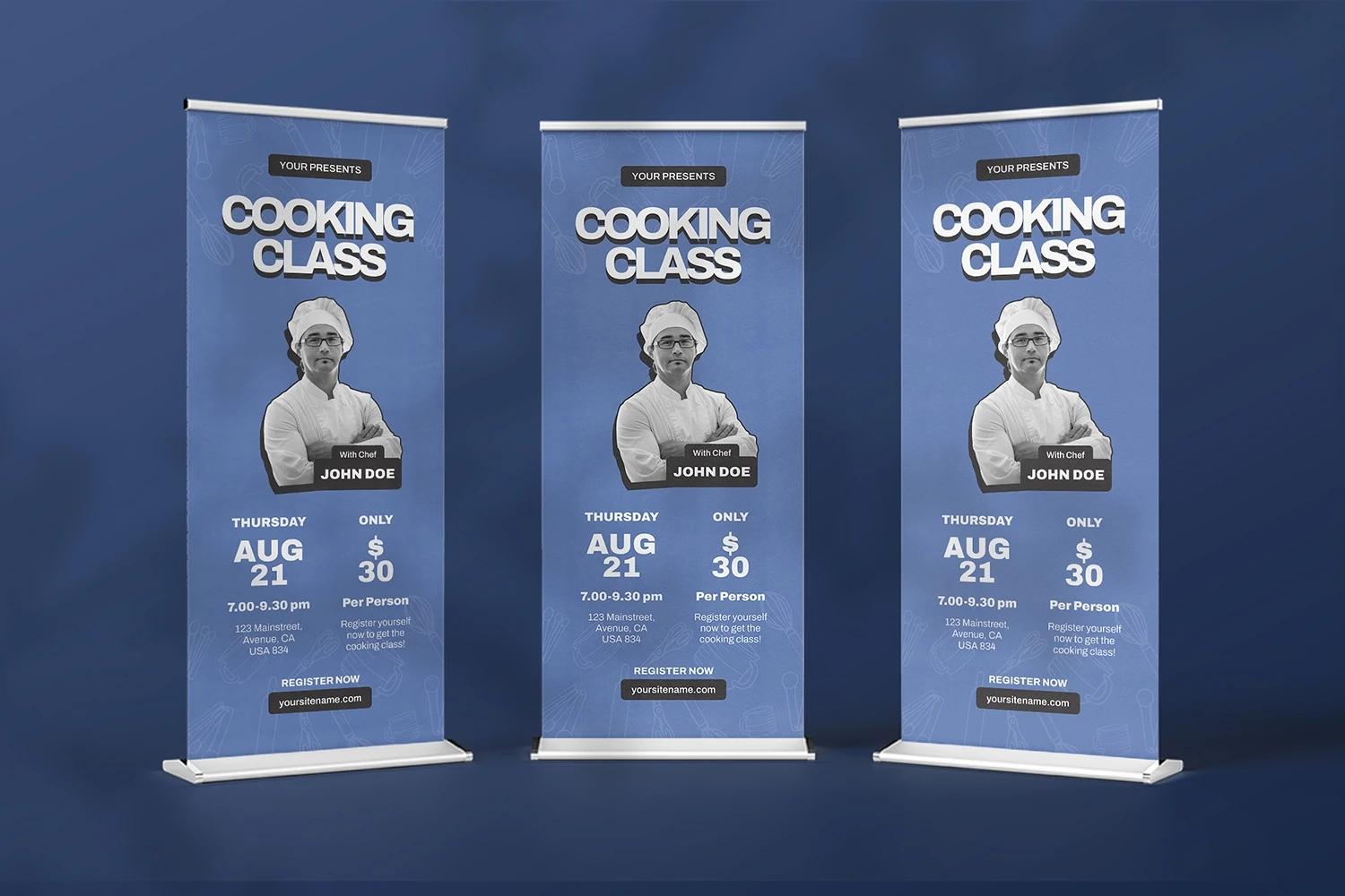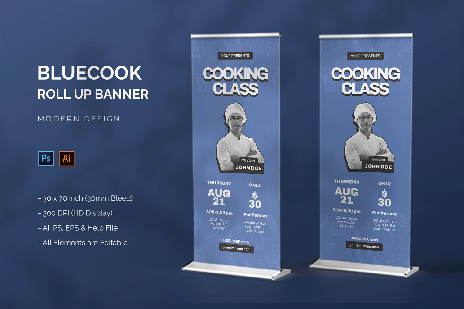 This is **Bluecook - Roll Up Banner** Don't wait, get it right now! , All Your Roll-Up Banner Needs, Professional or Personal. This stylish and adaptable template is perfect for your company's promotional materials.