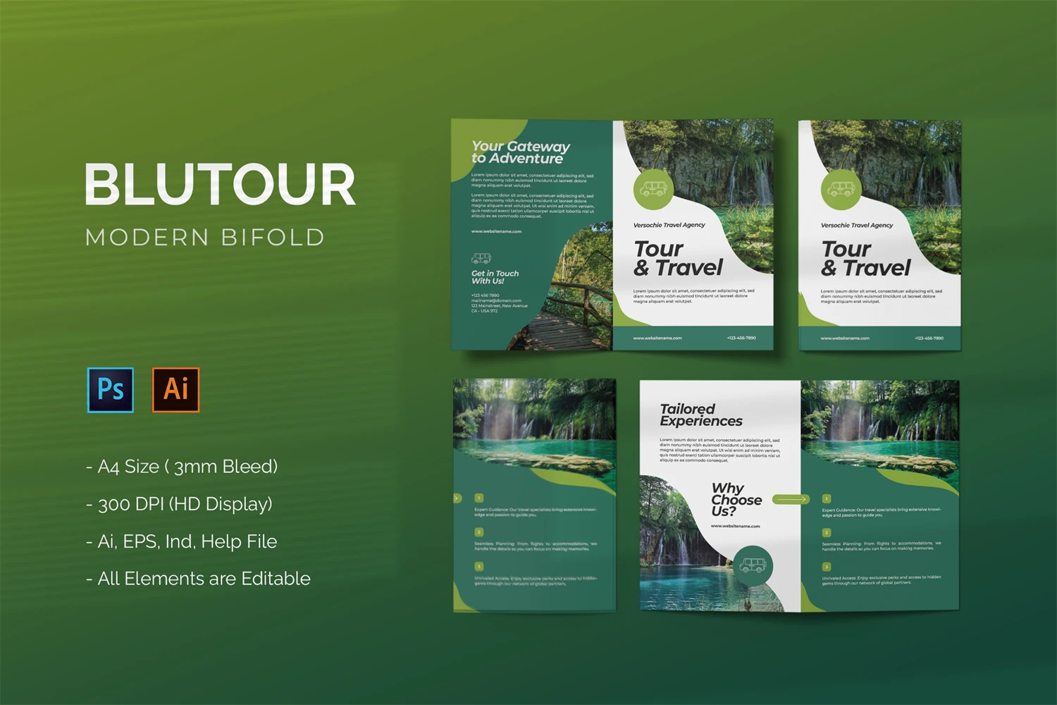This bifold brochure design template offers a visually engaging canvas to showcase your message, products, or services. With a well-organized layout and attention-grabbing graphics, each panel tells a part of your story.
