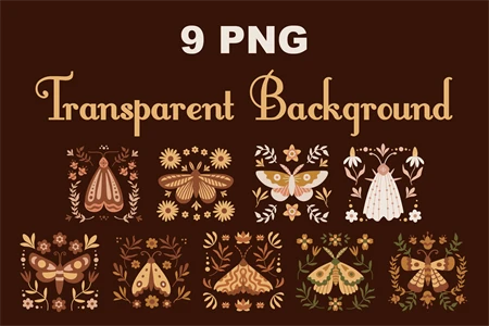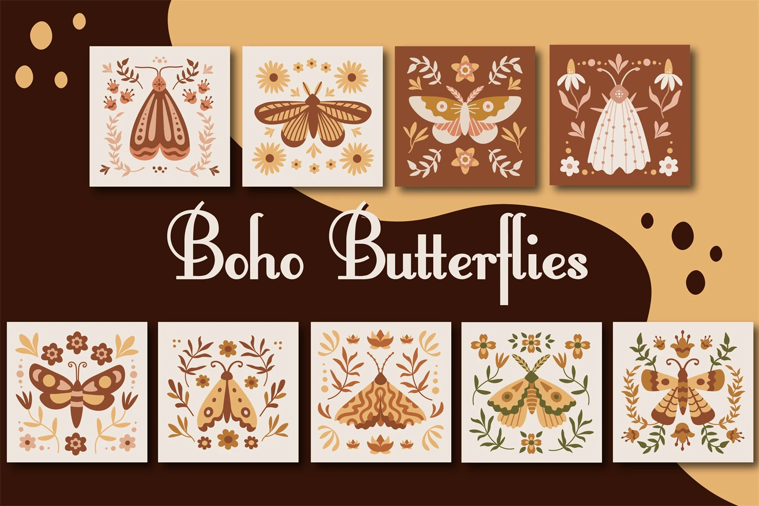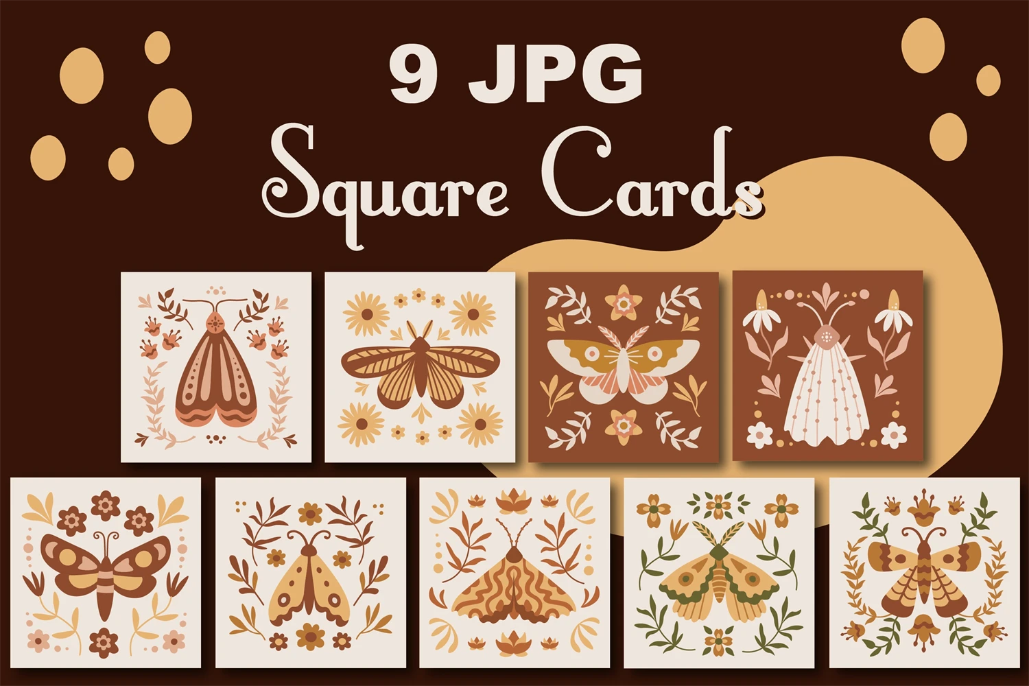 Boho Butterflies square cards and posters with leaves, brunches and twigs. Decorative nature elements with moths and butterflies in JPG and PNG formats.