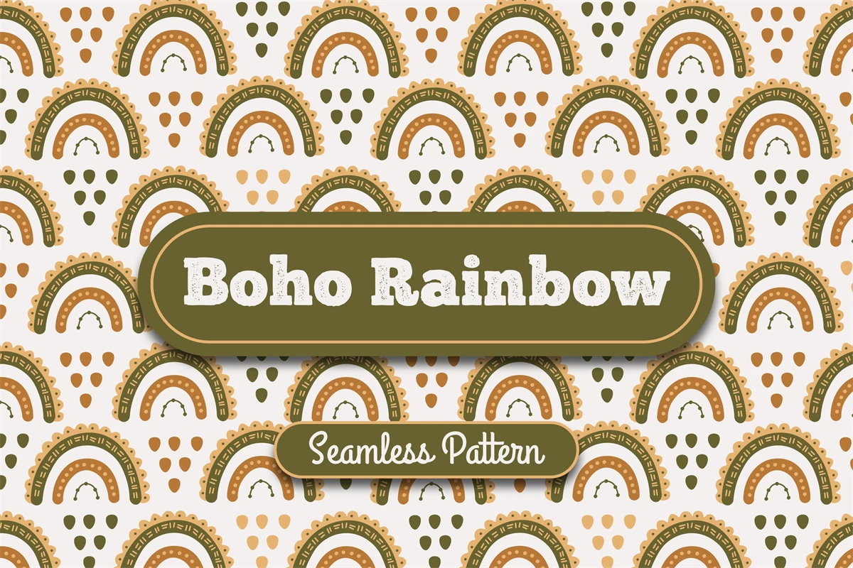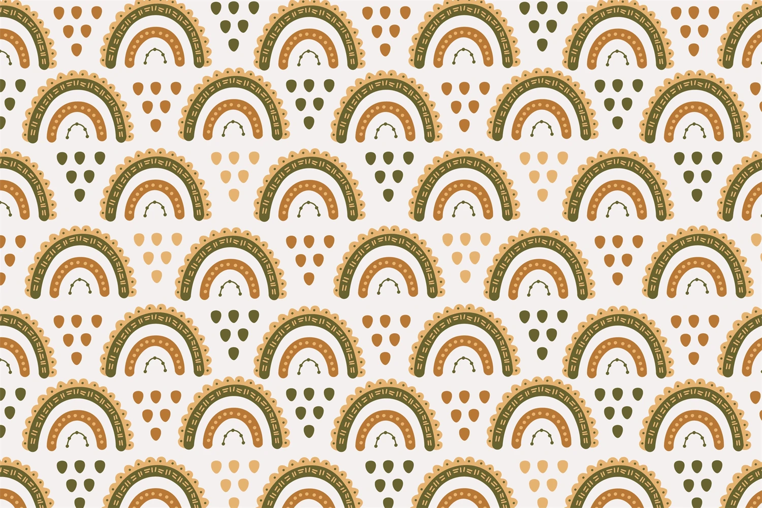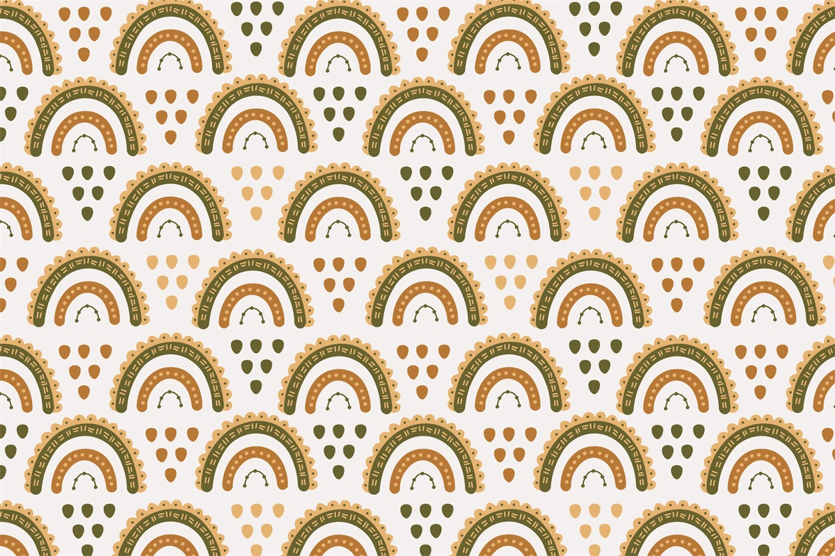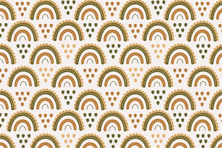 Cute bohemian style seamless background with rainbows and dots. Childish repeat vector illustration in hand-drawn Nordic style with boho rainbows for wrapping paper, textile, fabric, greeting cards, kids.