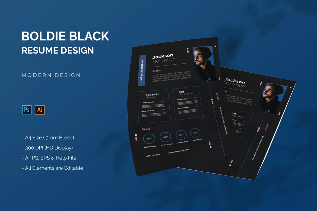 This is **Boldie Black - Resume Template** Get it now!, CV Resume for All business and personal needs. This design is great for your business and will make your interest, elegant, and easily editable according to your needs (**Adobe Illustrator, Adobe Photoshop**). You can use this CV Resume for personal purposes, or company purposes, I hope you enjoy this, Hope you Like it, and dont forget to rate it, Thanks.